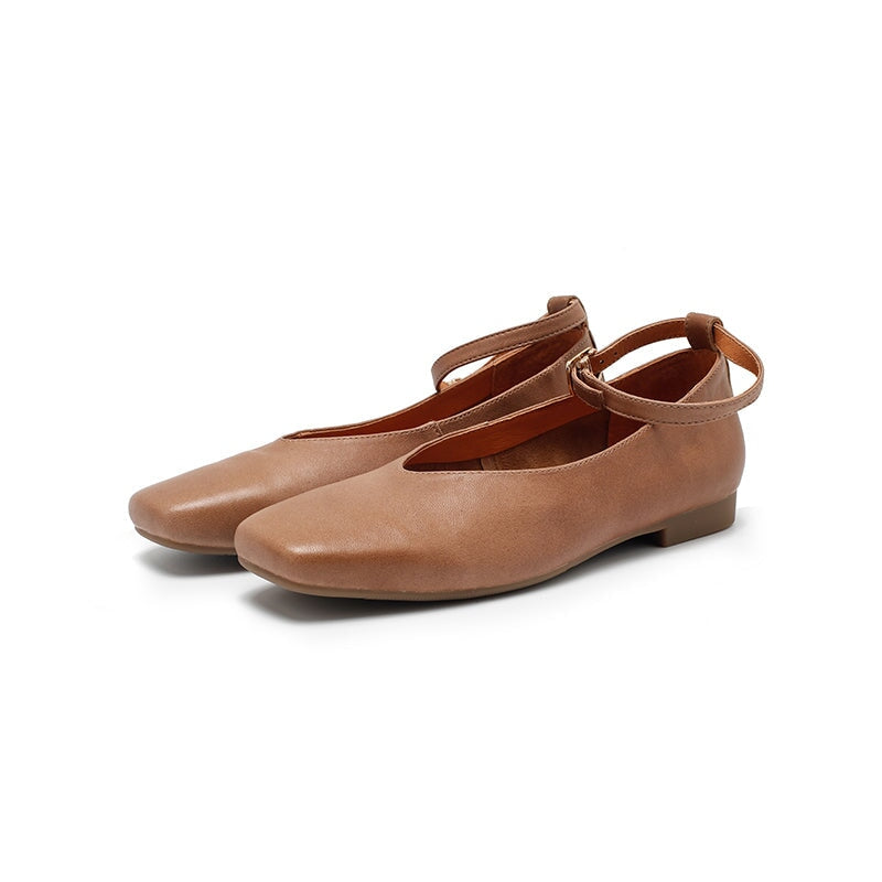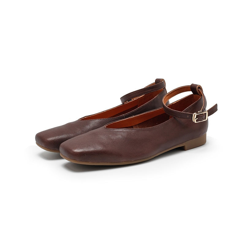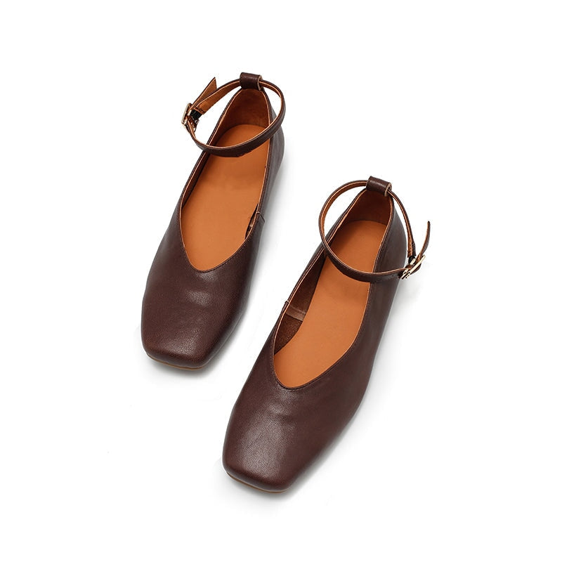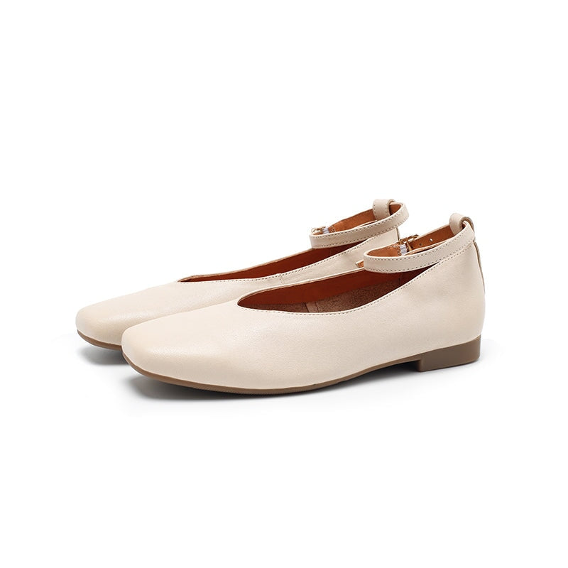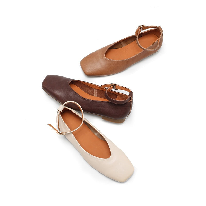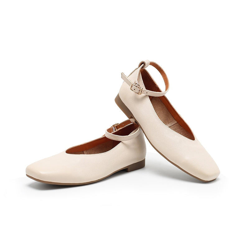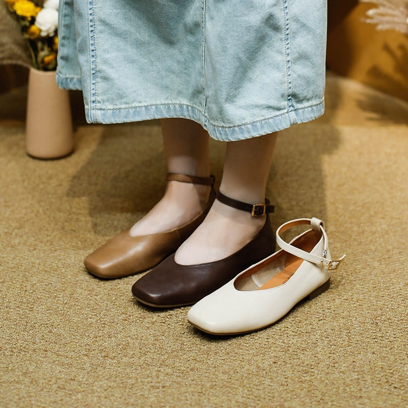 Dwarves Sheepskin Ankle Strap Mary Jane Flats Square Toe Ballet Shoes in Beige/Khaki/Coffee