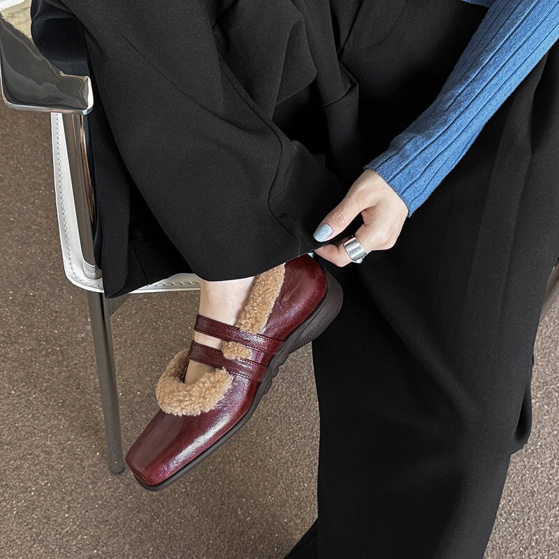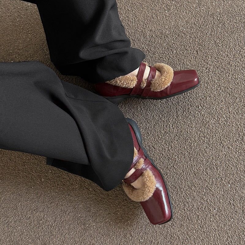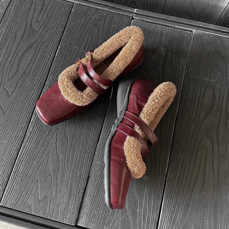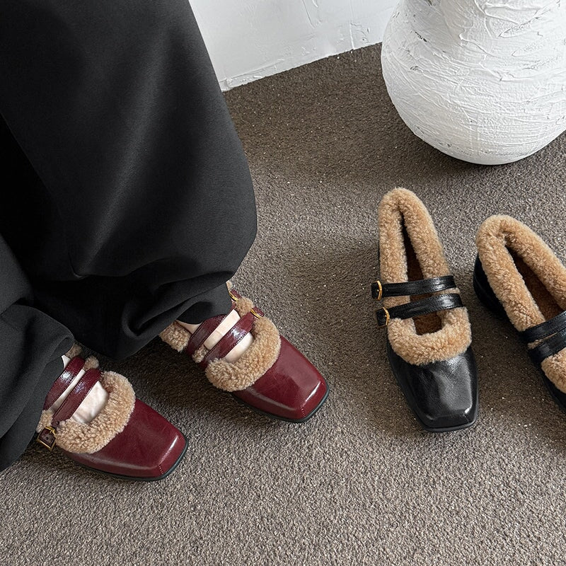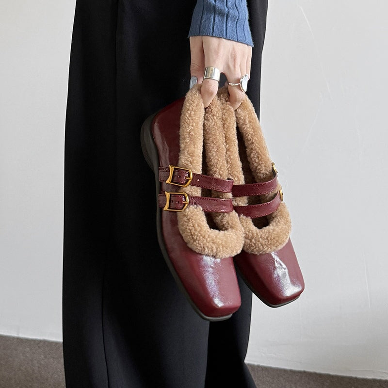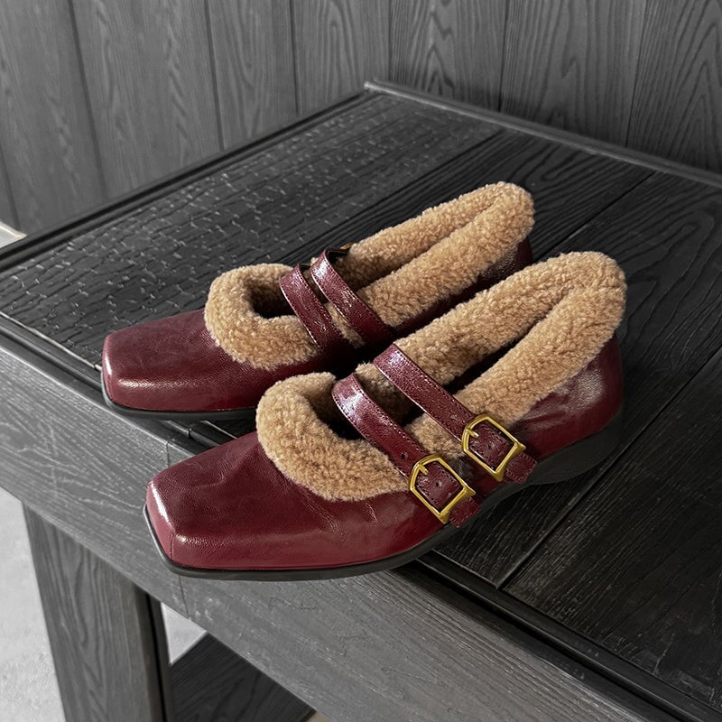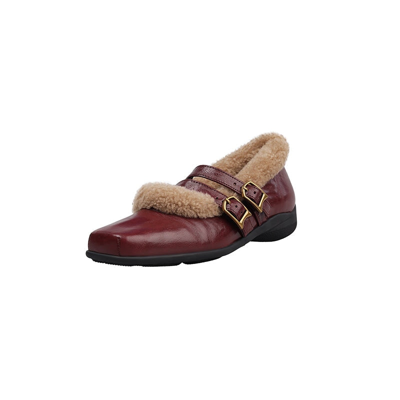 Winter Square Toe Mary Jane Shoes Double Buckle Full Grain Sheepskin & Shearling Flats in Wine Red/Black