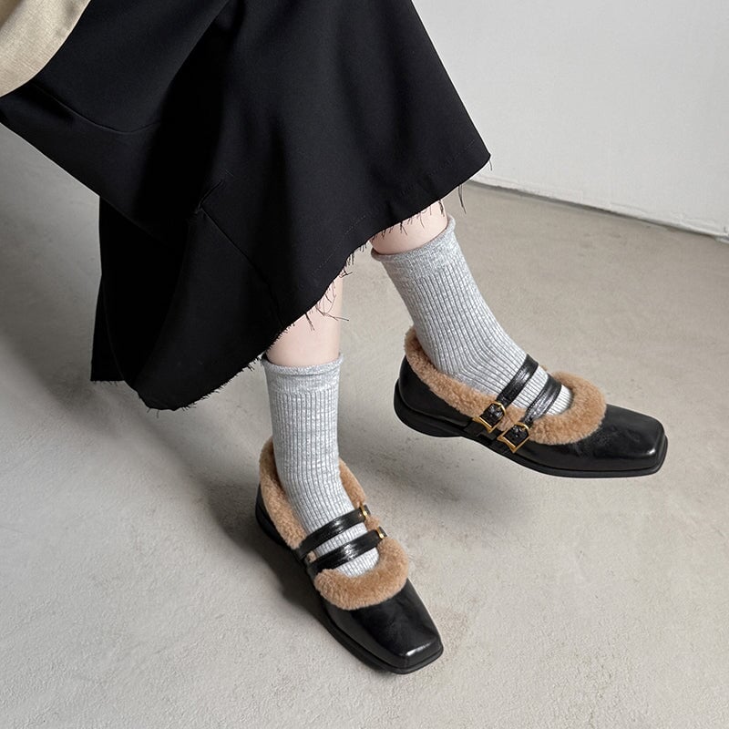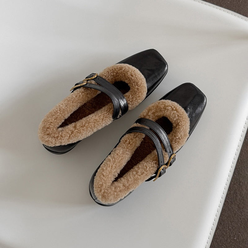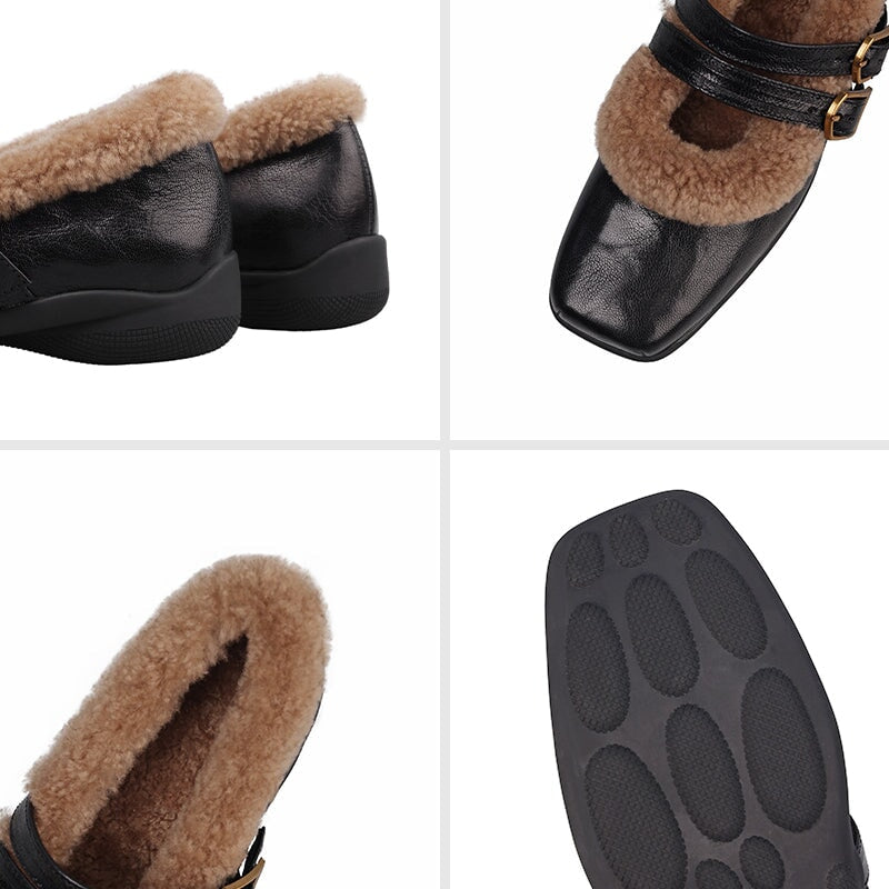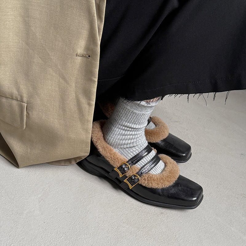 Stay warm and elegant this winter in these vintage-inspired Mary Jane shoes, crafted from premium full-grain sheepskin with a plush shearling lining for exceptional comfort. Designed with a stylish square toe and double buckle straps, these shoes blend classic charm with modern sophistication. The soft construction and durable rubber outsole ensure all-day wearability, while the low block heel adds subtle height without compromising comfort. Perfect for winter outfits, retro looks, and effortless everyday style.