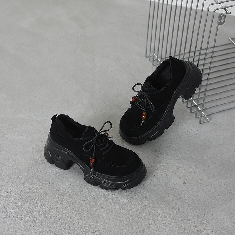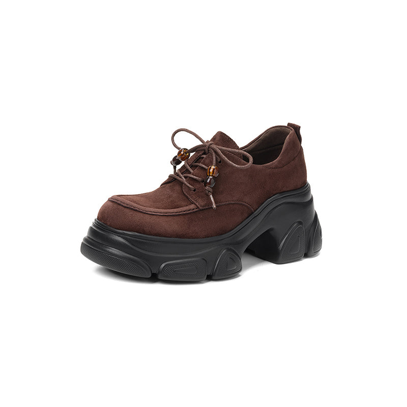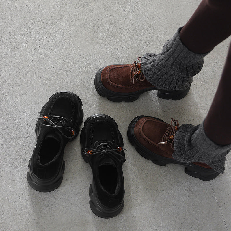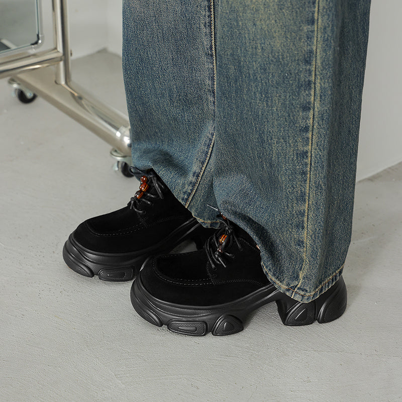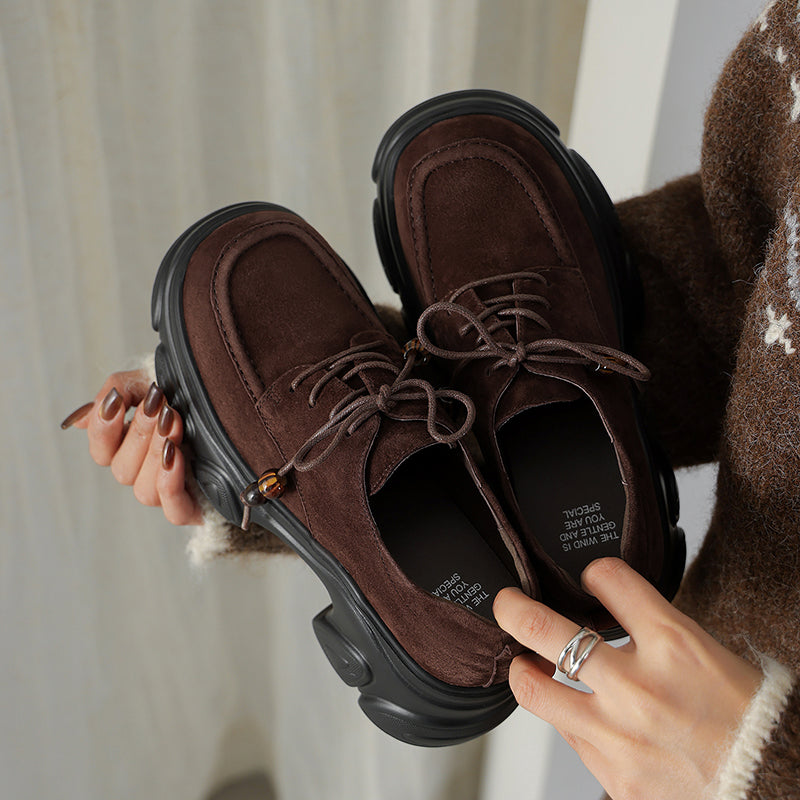 Designed with a round toe and lace-up closure, they are crafted from premium sheepskin suede leather for a soft yet structured feel. The 75mm platform heel and sculpted chunky sole add height and attitude while keeping the look balanced and wearable. Featuring a lightweight rubber foam outsole for cushioning and stability, these shoes are available with short plush lining for warmth or a leather lining for breathability, making them ideal for year-round wear. Perfect for casual outfits, street style, or edgy everyday looks, these platform oxford shoes deliver comfort, durability, and standout style in one.