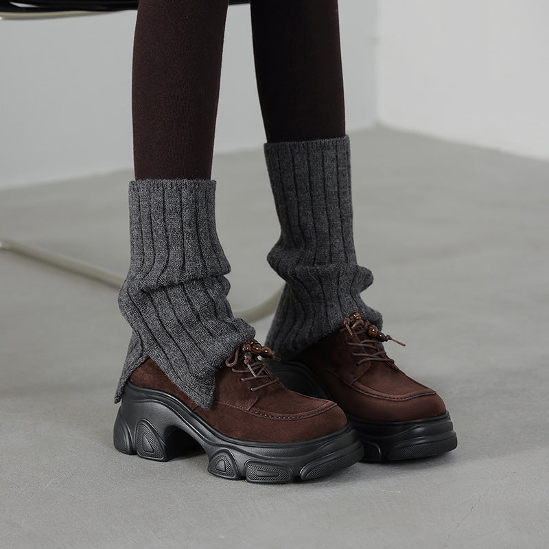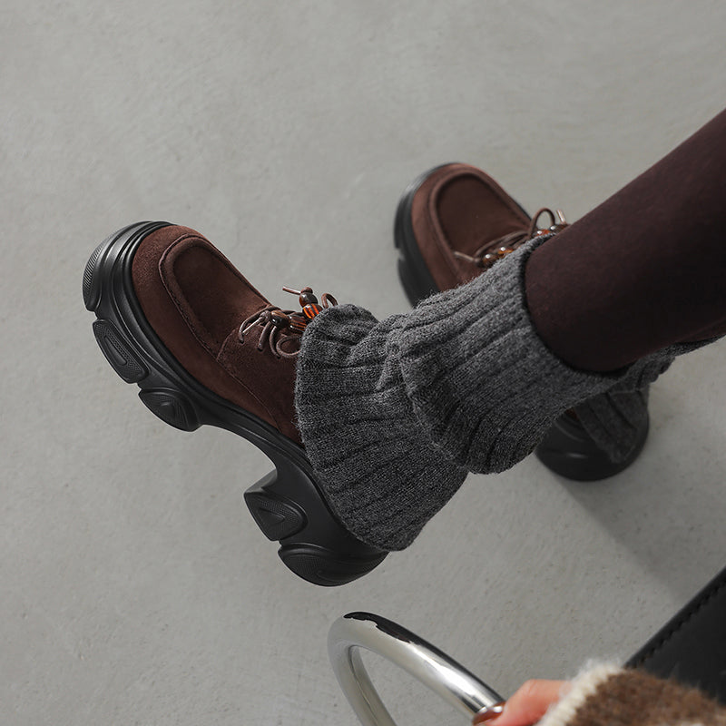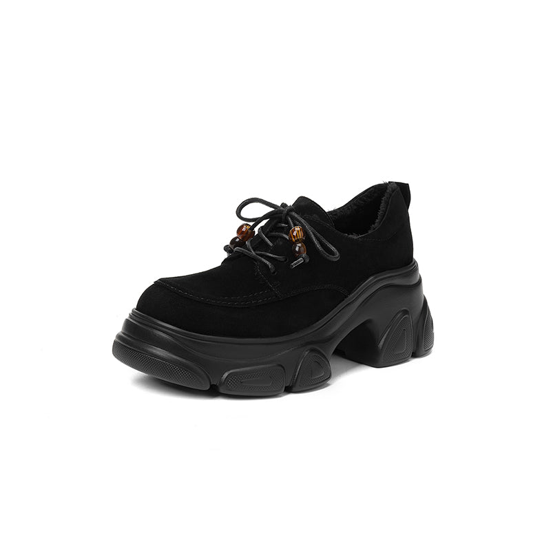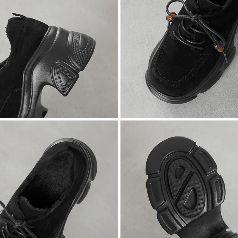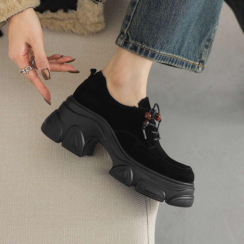 Designed with a round toe and lace-up closure, they are crafted from premium sheepskin suede leather for a soft yet structured feel. The 75mm platform heel and sculpted chunky sole add height and attitude while keeping the look balanced and wearable. Featuring a lightweight rubber foam outsole for cushioning and stability, these shoes are available with short plush lining for warmth or a leather lining for breathability, making them ideal for year-round wear. Perfect for casual outfits, street style, or edgy everyday looks, these platform oxford shoes deliver comfort, durability, and standout style in one.