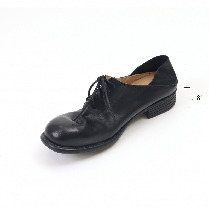 Horse Leather Derby Shoes Retro Round Toe Low Block Heel Lace Up Leather Shoes Black/White