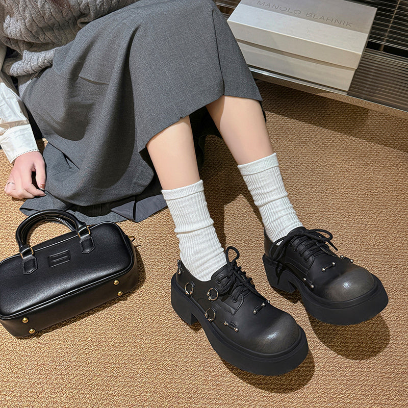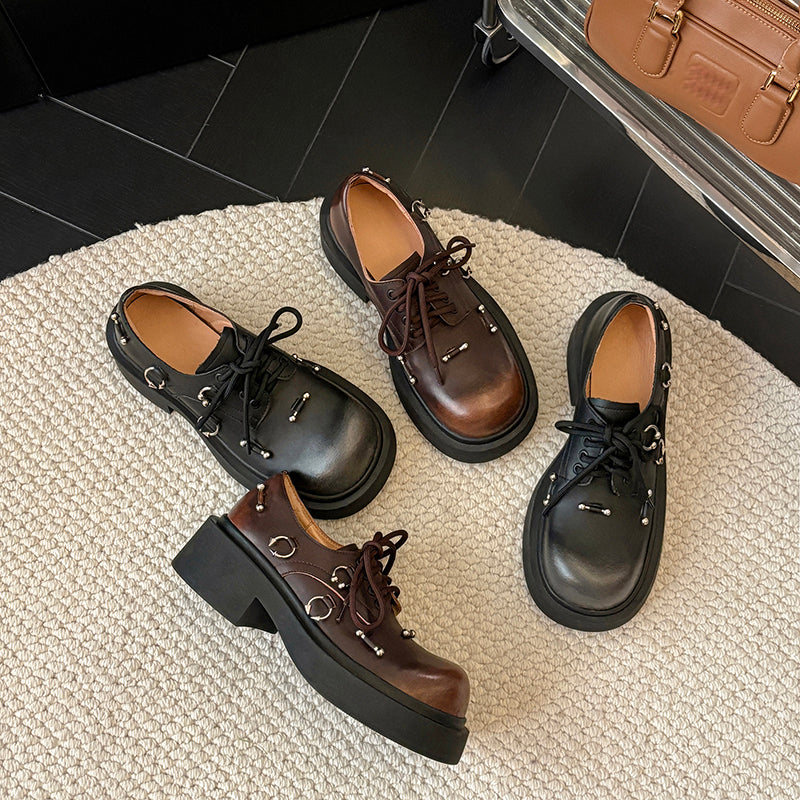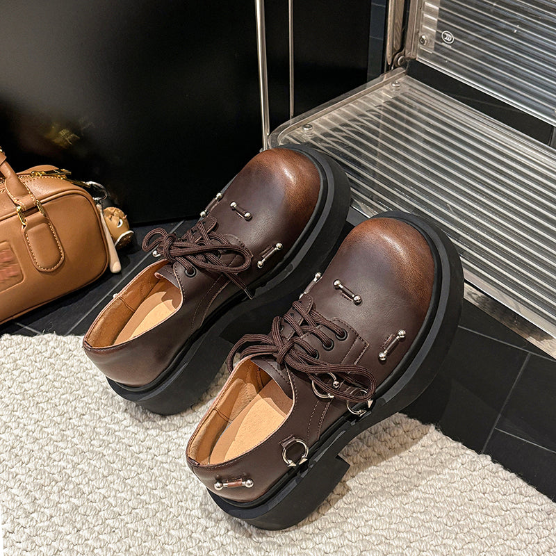Preppy Chunky Platform Oxford Shoes for Women Leather Lace-Up Designer Shoes with Metal Details in Black/Dark Brown