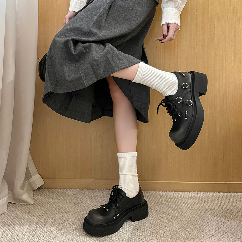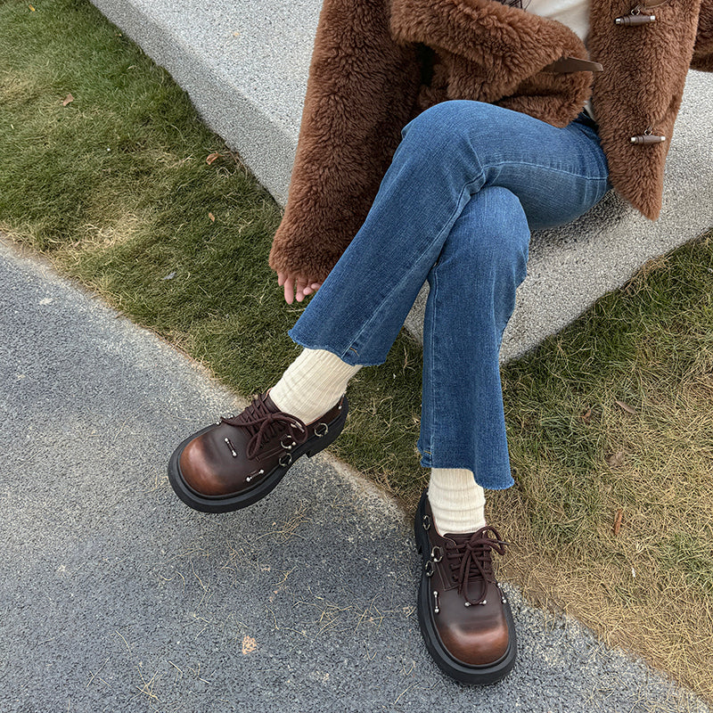 Step into bold, retro style with these chunky platform leather oxford shoes. Designed with a round toe, 50mm block heel, and thick platform sole, they blend comfort with statement-making fashion. Made from quality cowhide leather with vintage hand-burnished coloring, these oxfords feature unique metal hardware accents that add a chic, designer touch. The lace-up design ensures a secure fit, while the rubber foam outsole provides lightweight cushioning for all-day wear. Perfect for anyone who loves edgy, fashionable, vintage-inspired footwear.