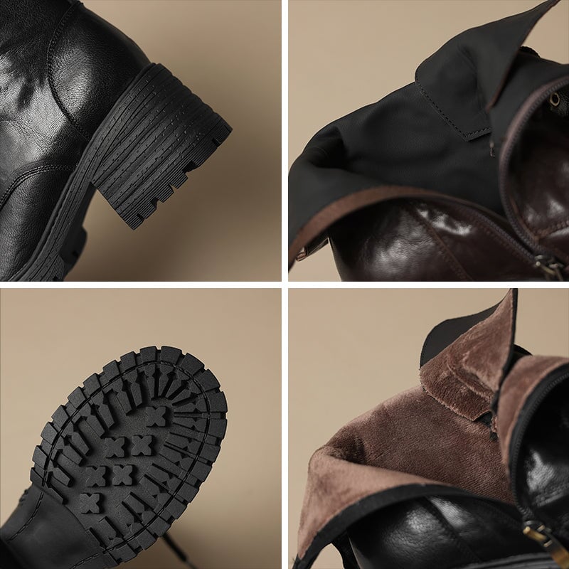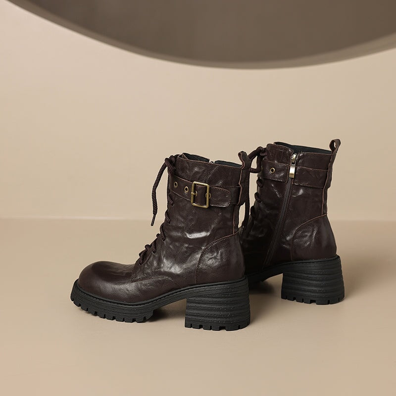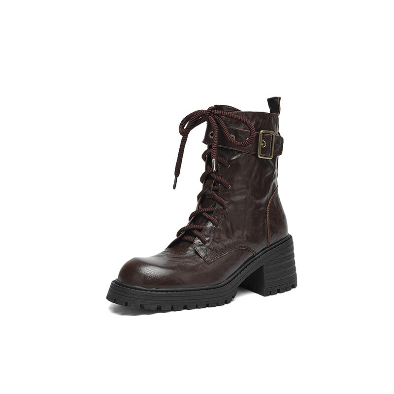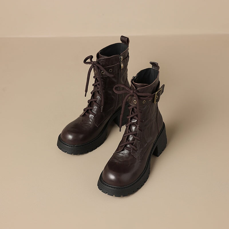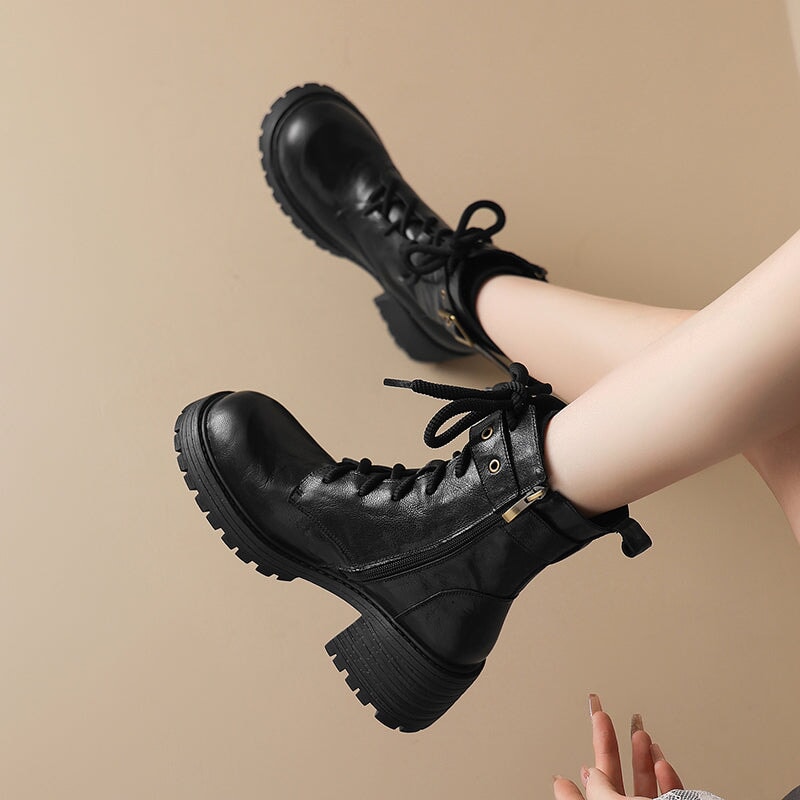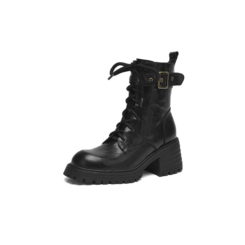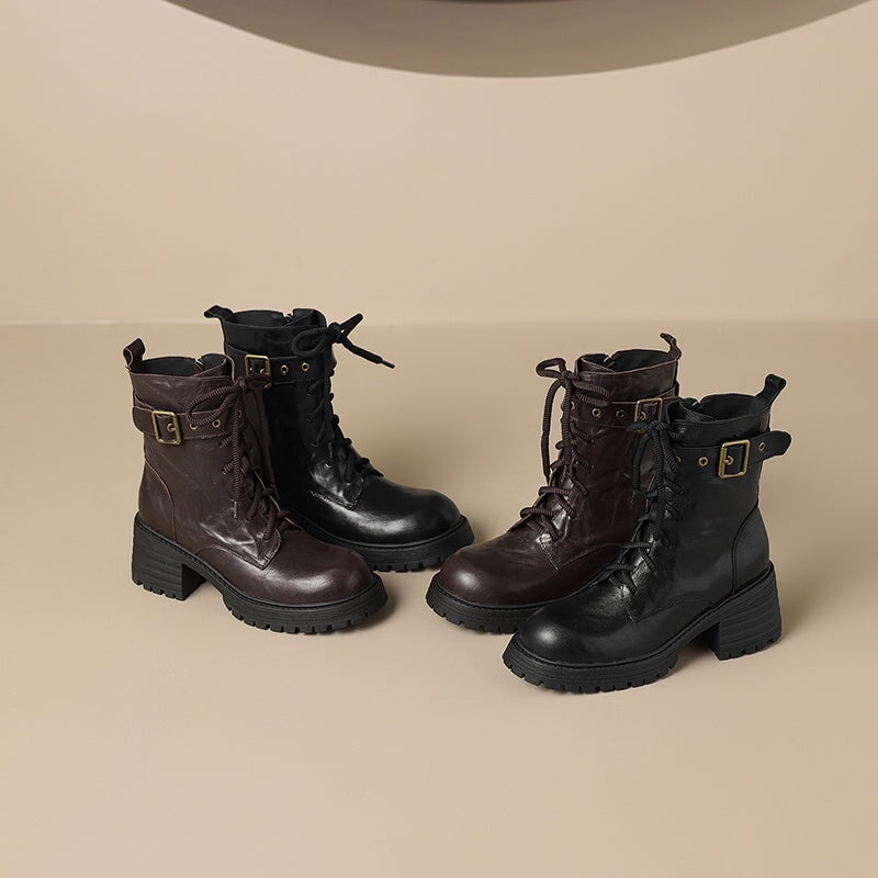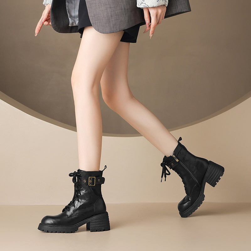 Elevate your punk-inspired British style with these women’s combat boots, crafted from premium top-layer sheepskin for a soft yet durable finish. Designed with a classic round toe, lace-up front, convenient side zipper, and bold buckle accents, these short boots deliver both edge and everyday practicality. The sturdy 60mm block heel offers height with stability, while optional short plush lining provides winter warmth and leather lining ensures breathable comfort for year-round wear. A perfect blend of fashion and function for street style, riding looks, and modern Martin-boot outfits.