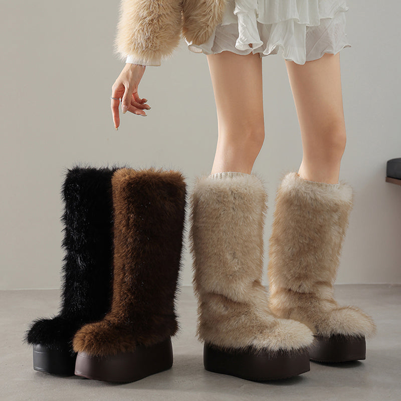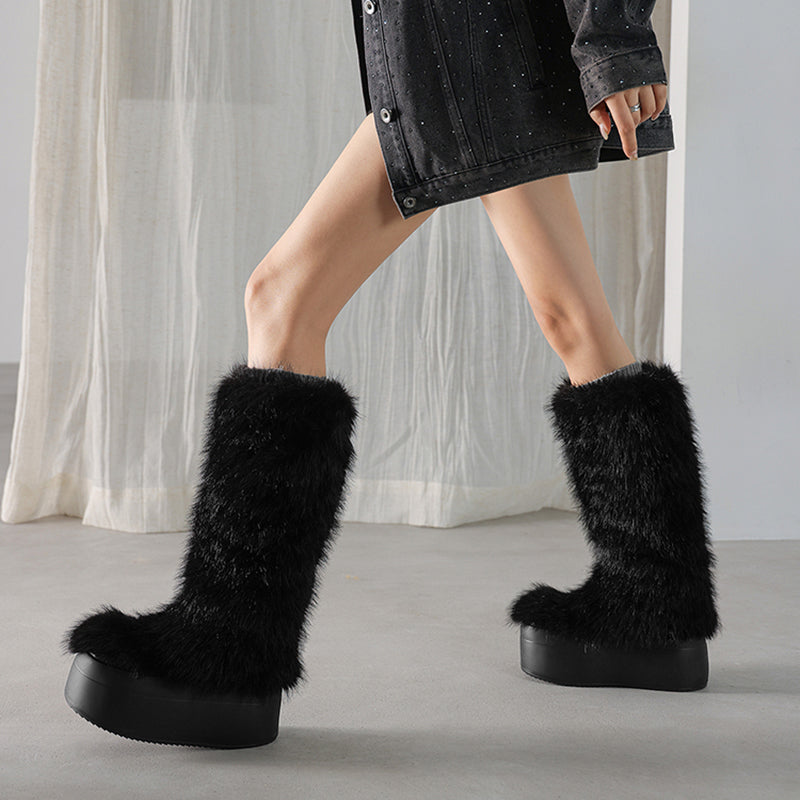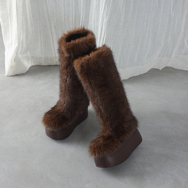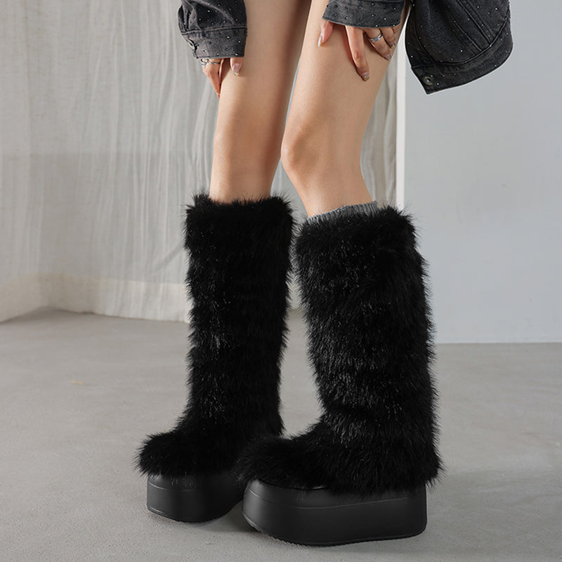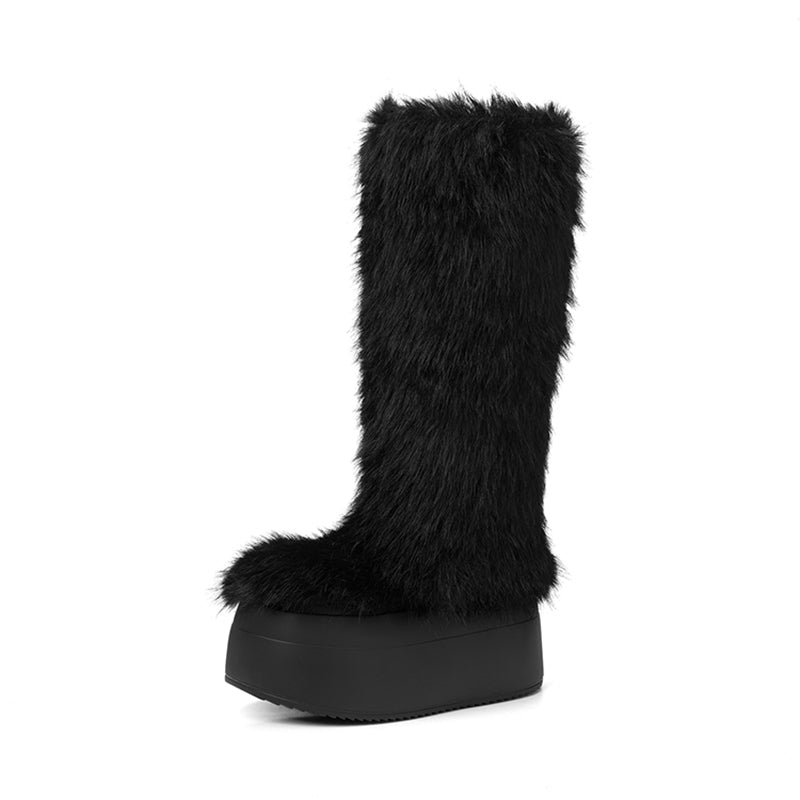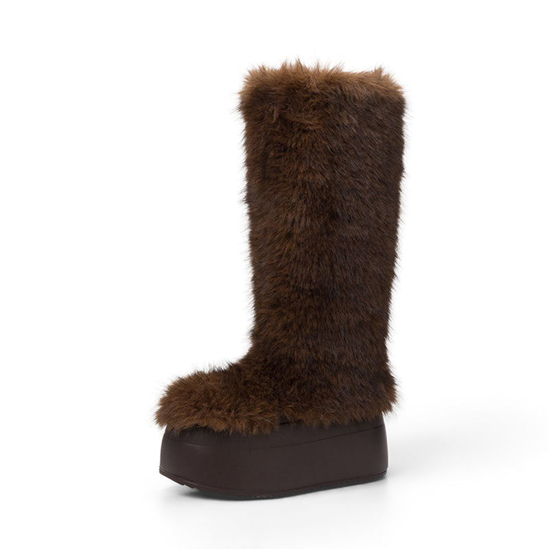 Shaggy Faux Fur Knee-High Platform Snow Boots 80mm Chunky Winter Boots in Coffee/Grey/Black