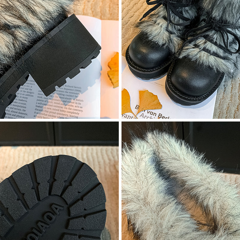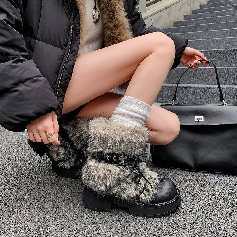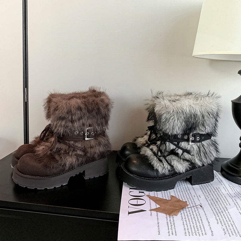 Shaggy Faux Fur Leather Winter Boots Chunky 50mm Heel Short Buckle Boots in Black/Brown