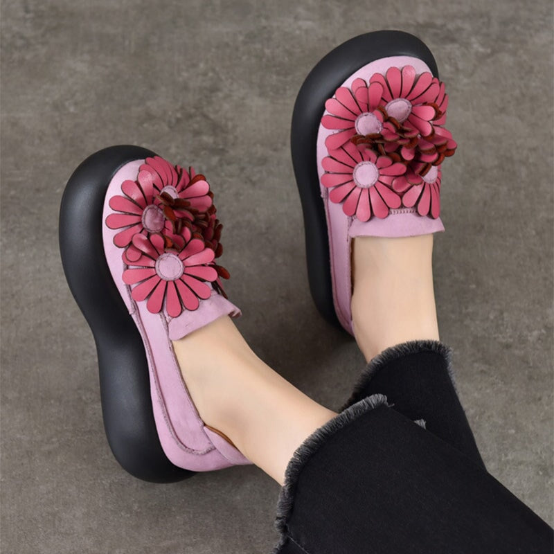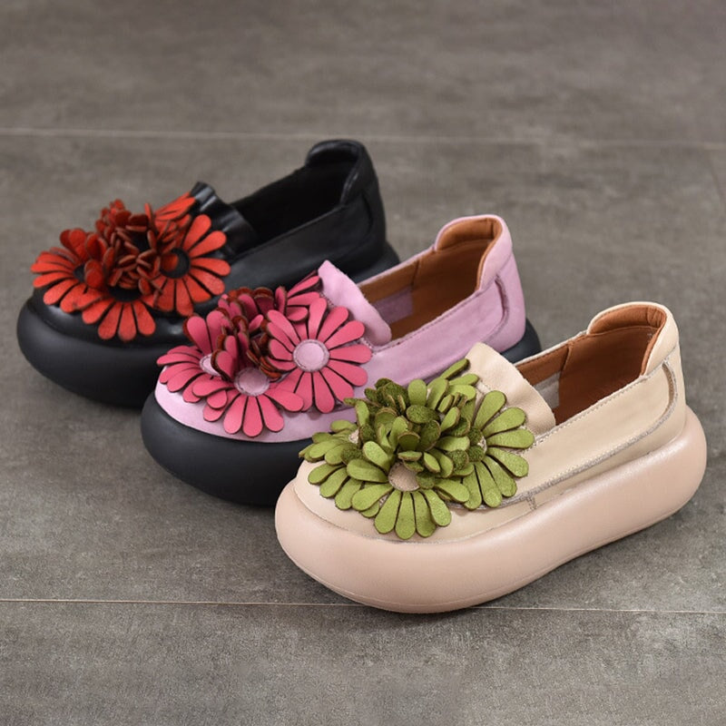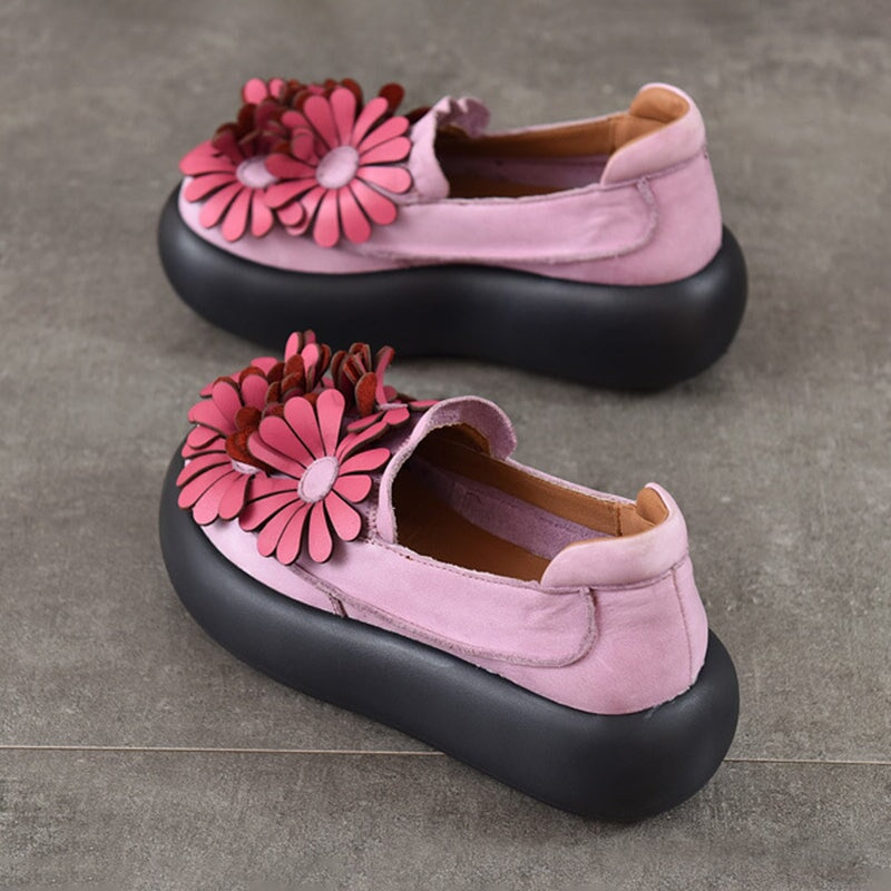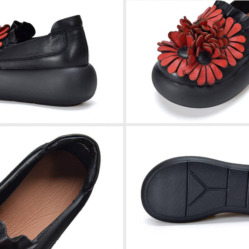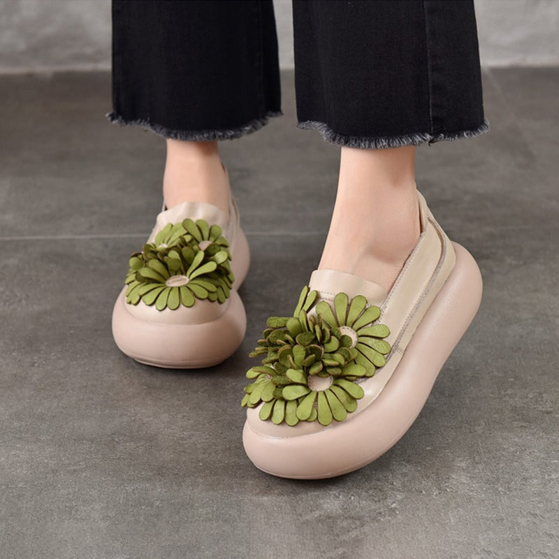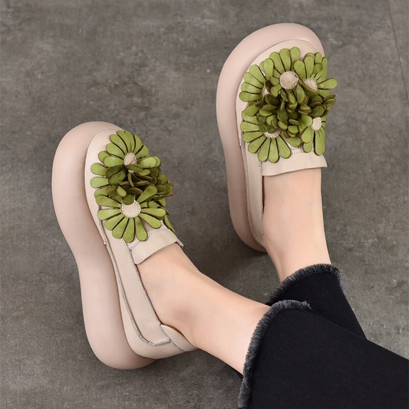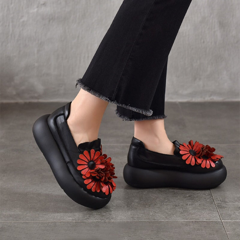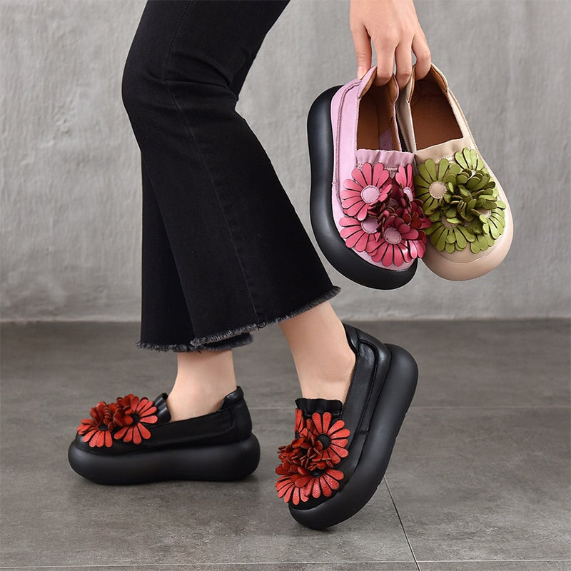 These elegant slip-on floral loafers feature a feminine 3D flower design on premium top layer cow leather, making them both stylish and unique. The round toe shape and soft construction offer natural comfort, while the lightweight rubber foam platform provides a stable 55mm height boost without adding pressure to the feet. Designed for effortless wear, these platform loafers combine softness, durability, and chic aesthetics—perfect for daily outfits, work styling, or dressy casual looks. A beautiful blend of elegance and comfort for women who want standout shoes they can wear all day.