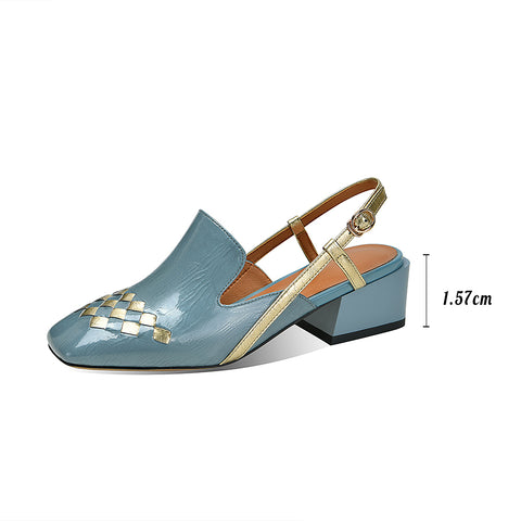 Genuine Leather Square Toe Slingback Sandals Block Heel in Black/Blue
