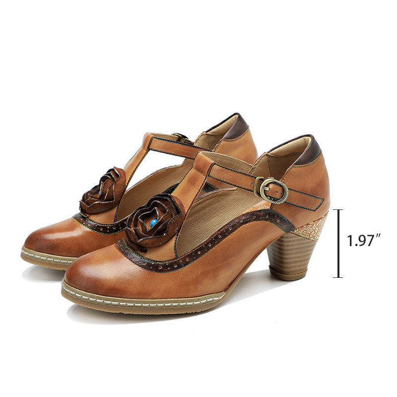 Handmade Leather T-strap Flower Mary Jane Shoes 50mm Block Heel in Brown