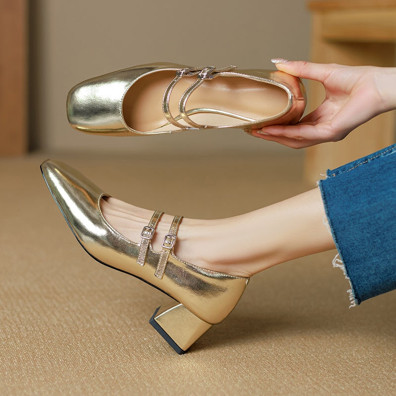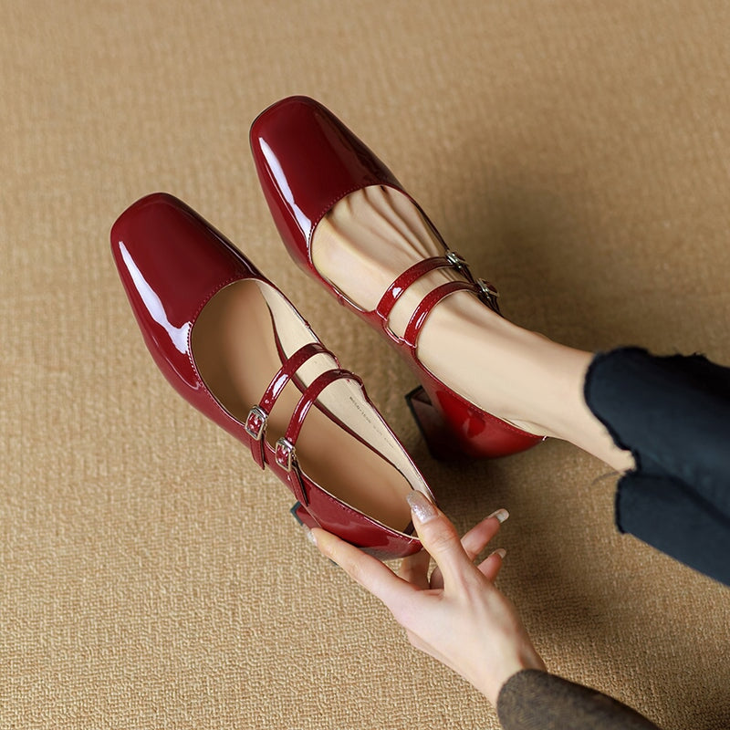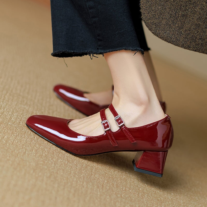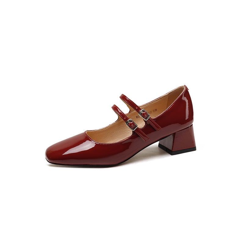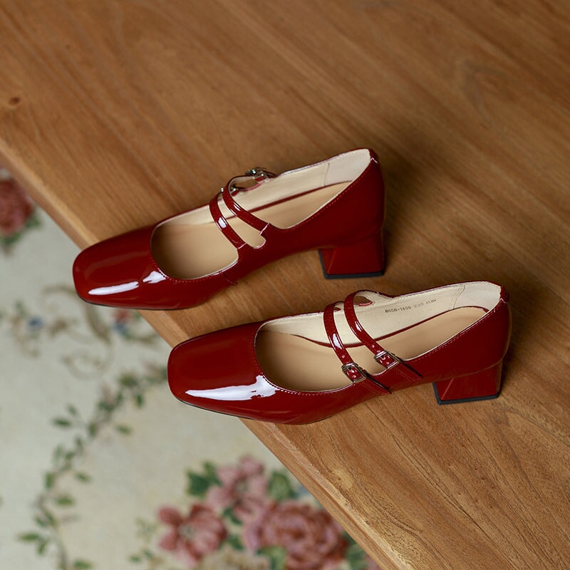 Crafted from premium coated cow patent leather, these handmade Mary Jane pumps feature a chic double-strap design with a secure buckle closure. The square toe and stable block heel add both elegance and comfort, while the rubber sole ensures durability for all-day wear. Perfect as office shoes, fashion shoes, or stylish wedding pumps.