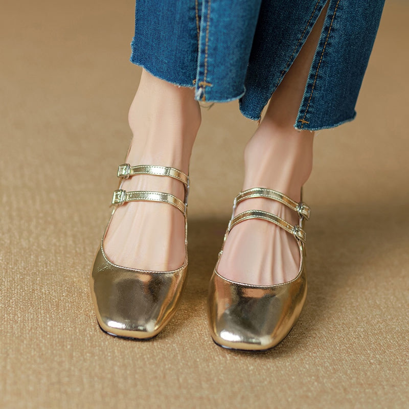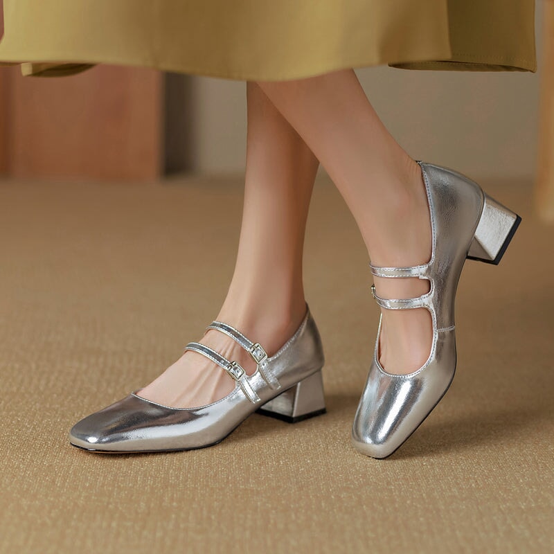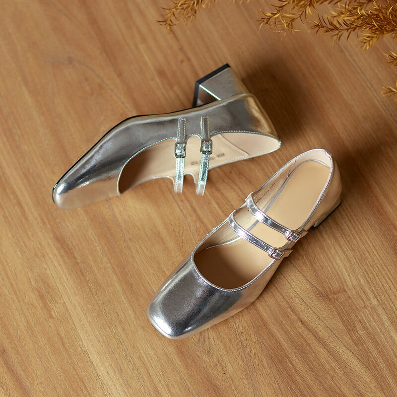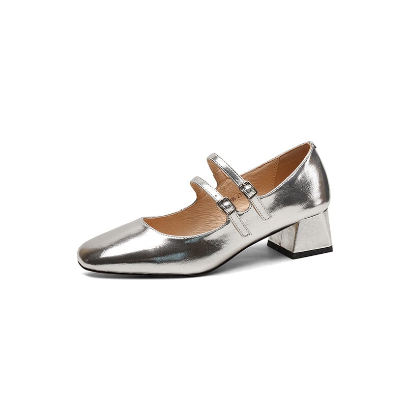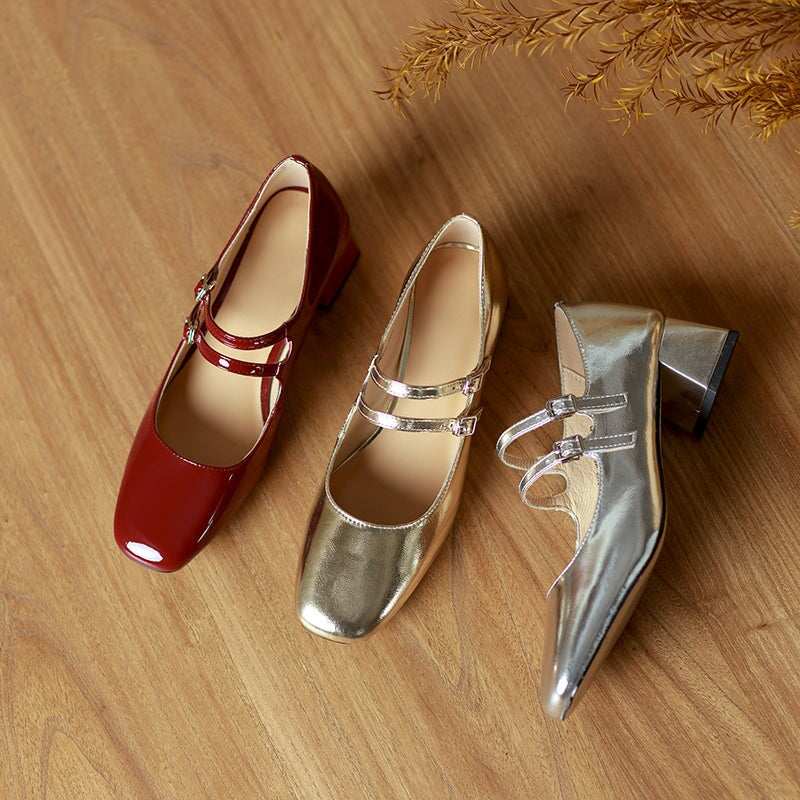 Handmade Patent Leather Mary Jane Pumps Double Strap Dress Shoes for Women in Sliver/Wine Red/Gold