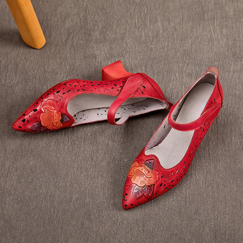 Handmade Traditional Chinese Style Leather Pumps Retro Floral Hollow Out Shoes in Red