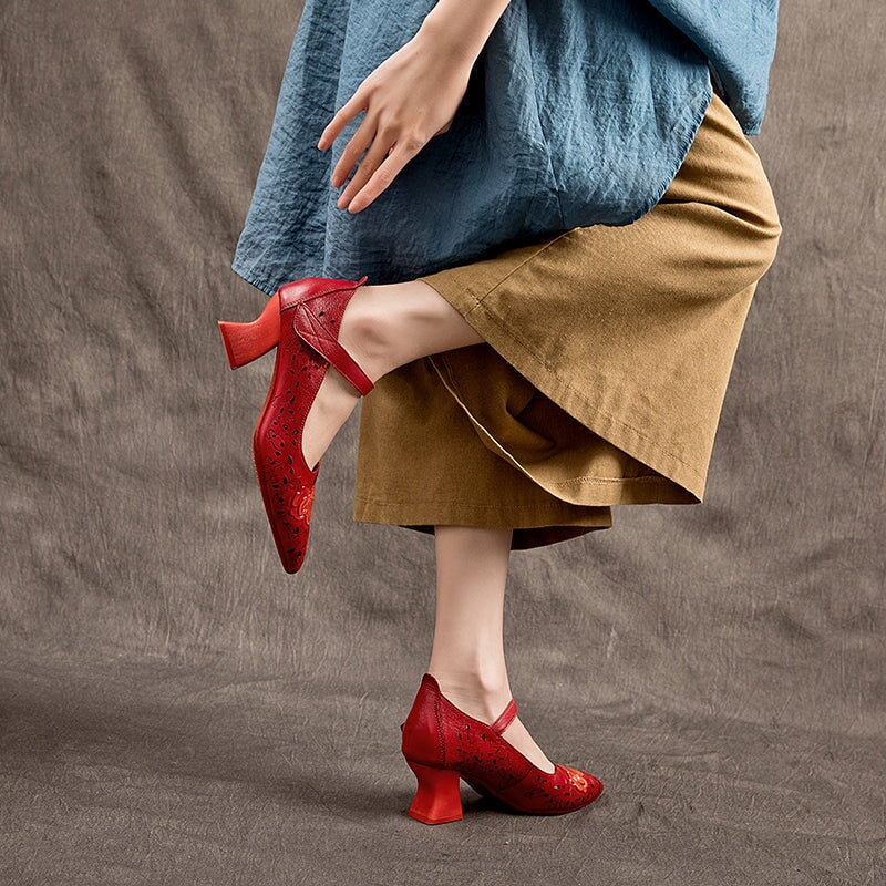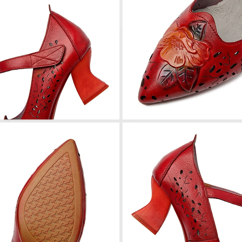 Step into timeless elegance with these handmade traditional Chinese style pumps, beautifully crafted from premium top-grain cow leather. Featuring a graceful pointed toe, classic block heel, and easy Velcro strap closure, these shoes combine traditional charm with everyday comfort. The floral hollow-out design adds a touch of artistry and sophistication, while the high-elastic rubber sole provides softness, durability, and non-slip performance. Perfect for both casual and formal occasions, these retro-inspired elegant pumps showcase exquisite craftsmanship and cultural heritage in every detail.