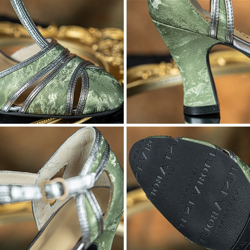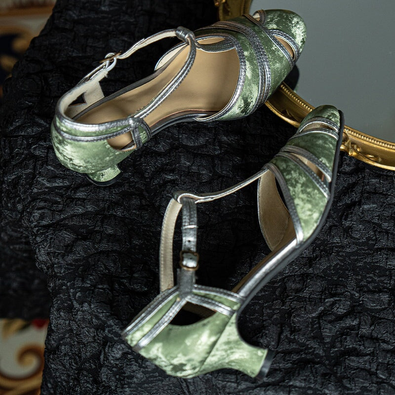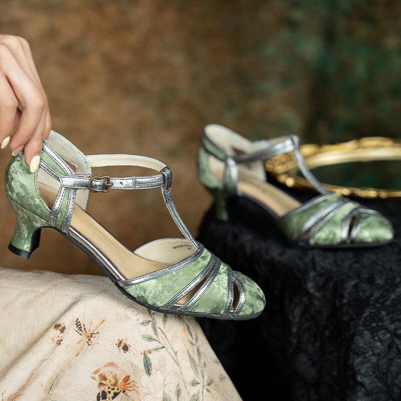 Handmade Vintage T-Strap Cutout Pumps Elegant Satin Leather Mary Jane Evening Shoes in Black/Green
