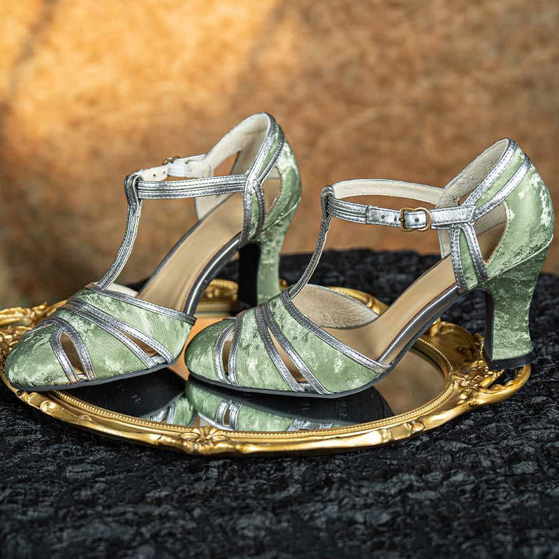 Step into refined vintage elegance with these handmade T-strap cutout pumps, inspired by 1920s through 1930s retro glamour and classic Chinese cheongsam (qipao) fashion. Crafted with a mix of satin-textured soft cow leather and smooth cow leather, they offer a luxurious sheen and graceful silhouette. The cutout design paired with an 80mm balanced heel elongates the leg while staying stable and comfortable for hours. These pumps blend the charm of Mary Jane styling with a sleek, vintage evening feel perfect for both modern and retro wardrobes.