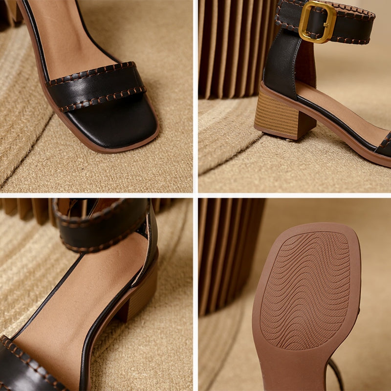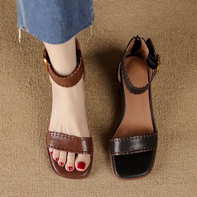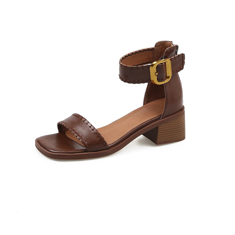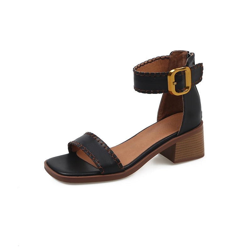Leather Open Toe Block Heel Sandals with Metal Buckle Retro Roman Style in Black/Brown