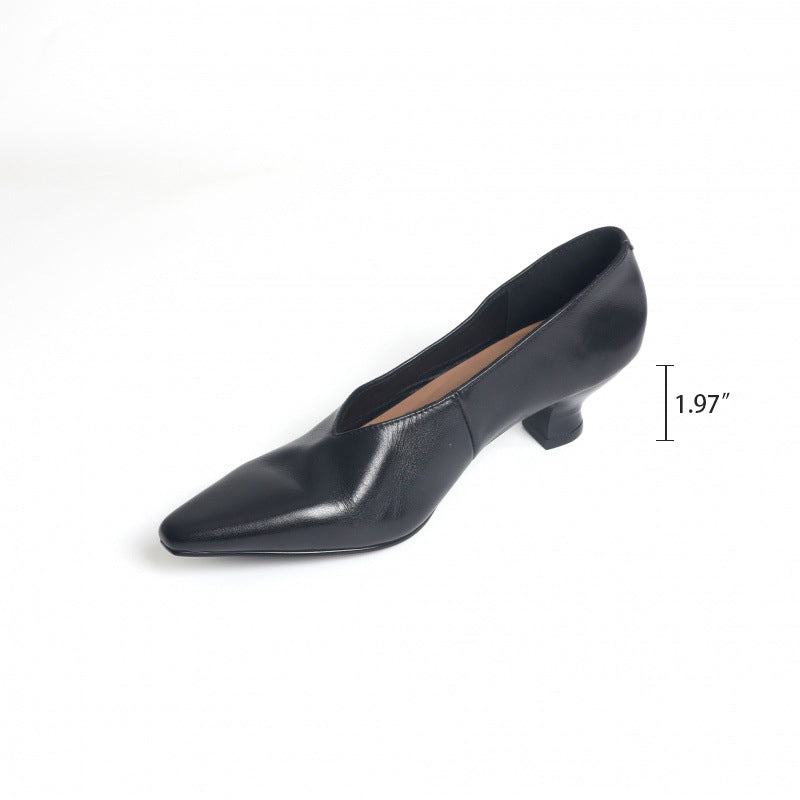 Leather Pointed Toe Kitty Heel Slip-On Pumps Office Shoes in Black