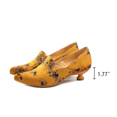 New Arrival Handmade Leather Pumps Kitten Heels Pointed Toe Retro Printing Style in Blue/Yellow