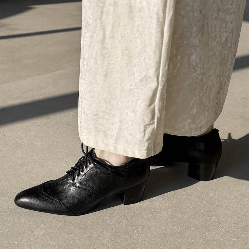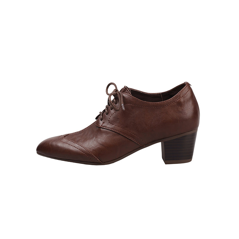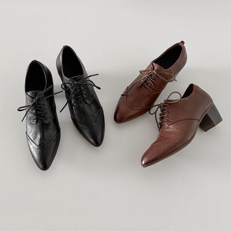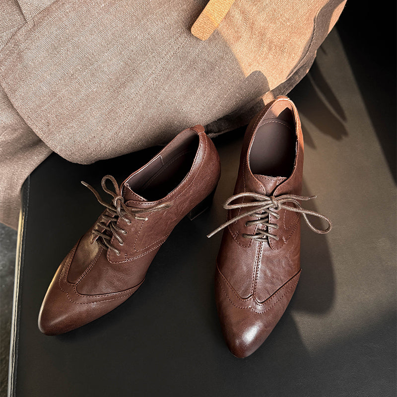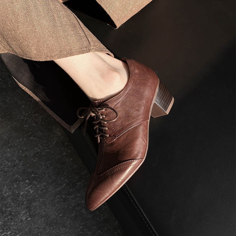 Classic vintage Oxford shoes featuring a sleek pointed toe and elegant lace-up design. Crafted from premium full grain cow leather with a distressed finish, these handmade block heel shoes offer timeless retro style, lasting comfort, and a durable rubber sole for everyday wear. Each pair is carefully handmade by skilled craftsmen, ensuring lasting comfort and timeless retro style.