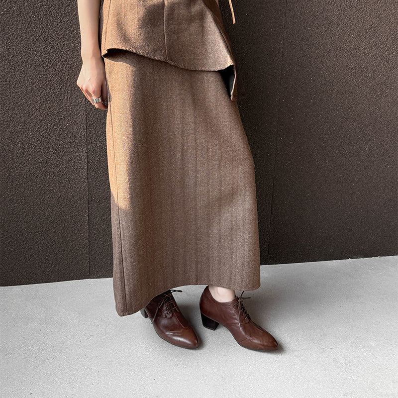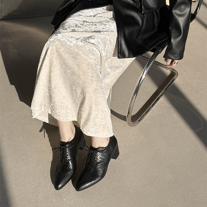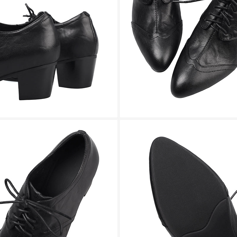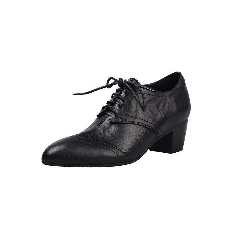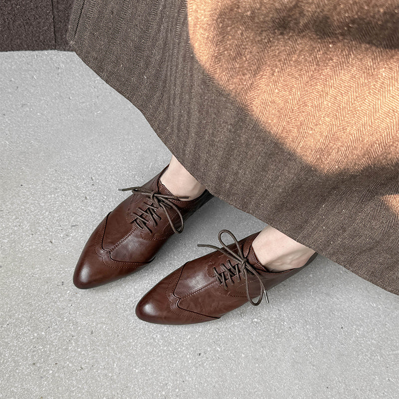 Classic vintage Oxford shoes featuring a sleek pointed toe and elegant lace-up design. Crafted from premium full grain cow leather with a distressed finish, these handmade block heel shoes offer timeless retro style, lasting comfort, and a durable rubber sole for everyday wear. Each pair is carefully handmade by skilled craftsmen, ensuring lasting comfort and timeless retro style.