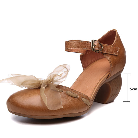Sweet Flower Handmade Leather Mid Heel Women's Shoes Round Toe Retro Buckle Sandals Brown/Off White