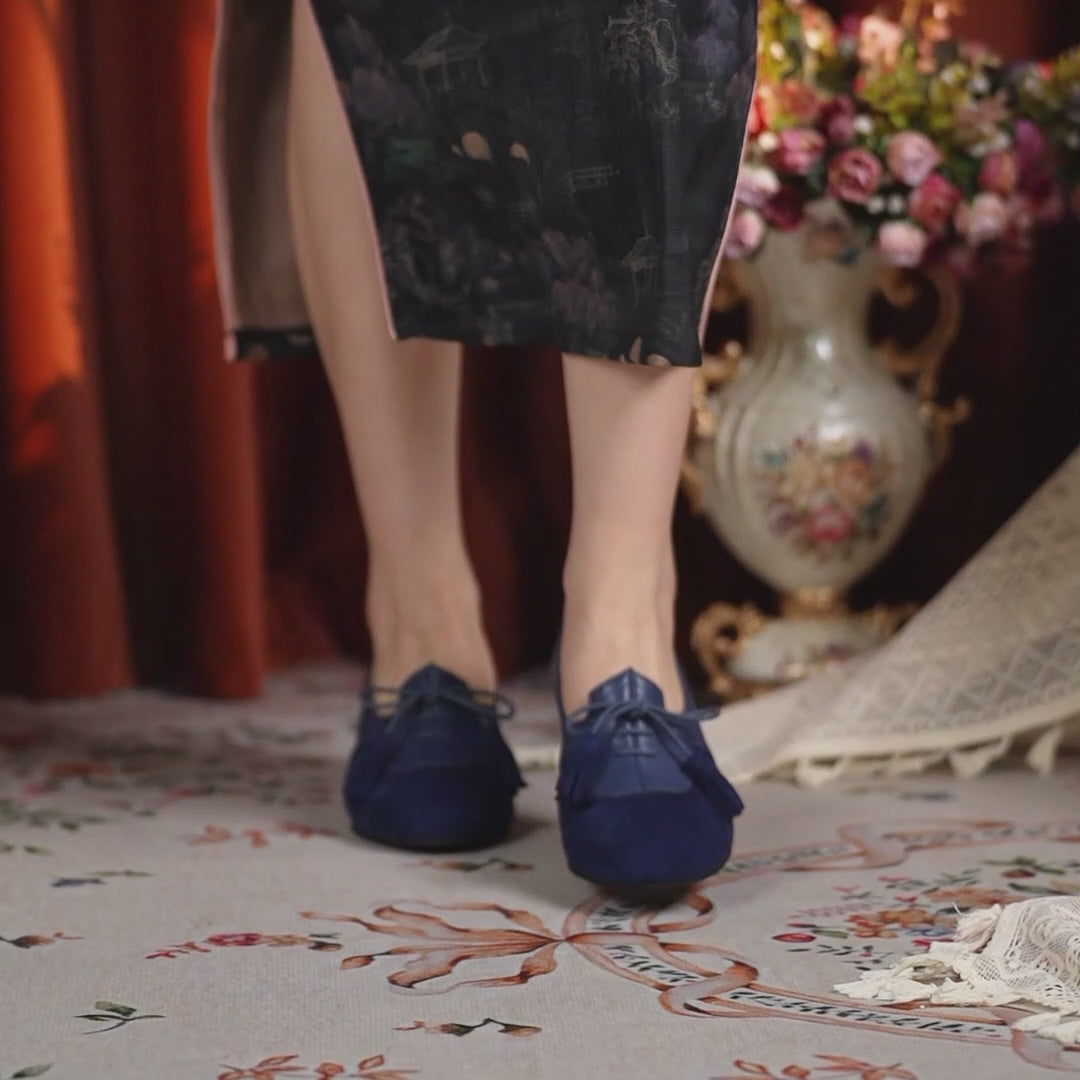 Step into refined vintage charm with these handmade brogue tassel pumps, designed in a classic British Oxford style with modern elegance. Featuring a unique mix of soft cow leather and suede, these shoes offer both texture and sophistication. The round toe design ensures comfort, while the 50mm mid heel gives you a graceful lift without sacrificing stability. The lace-up front with tassel details adds personality and a touch of retro romance.