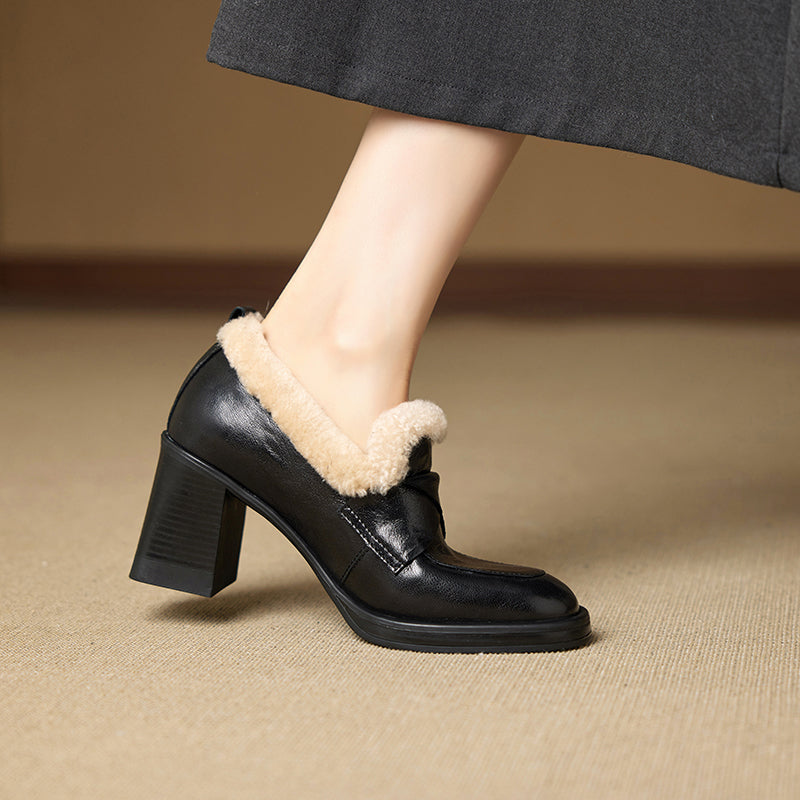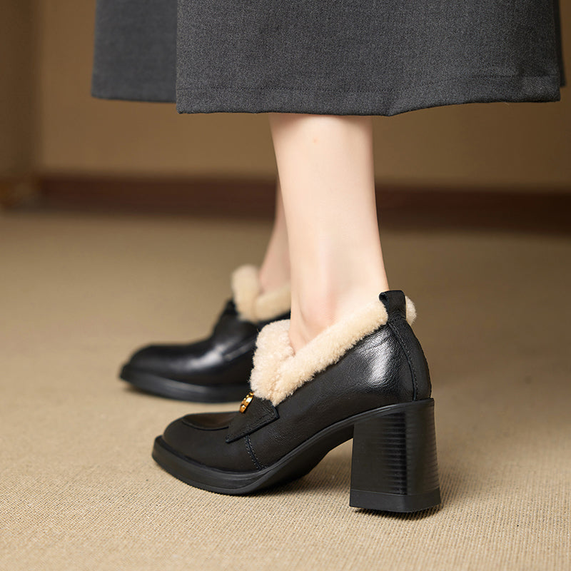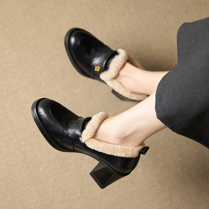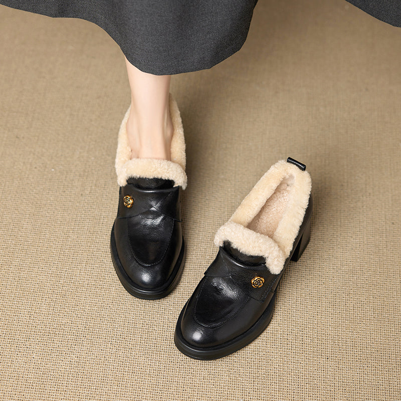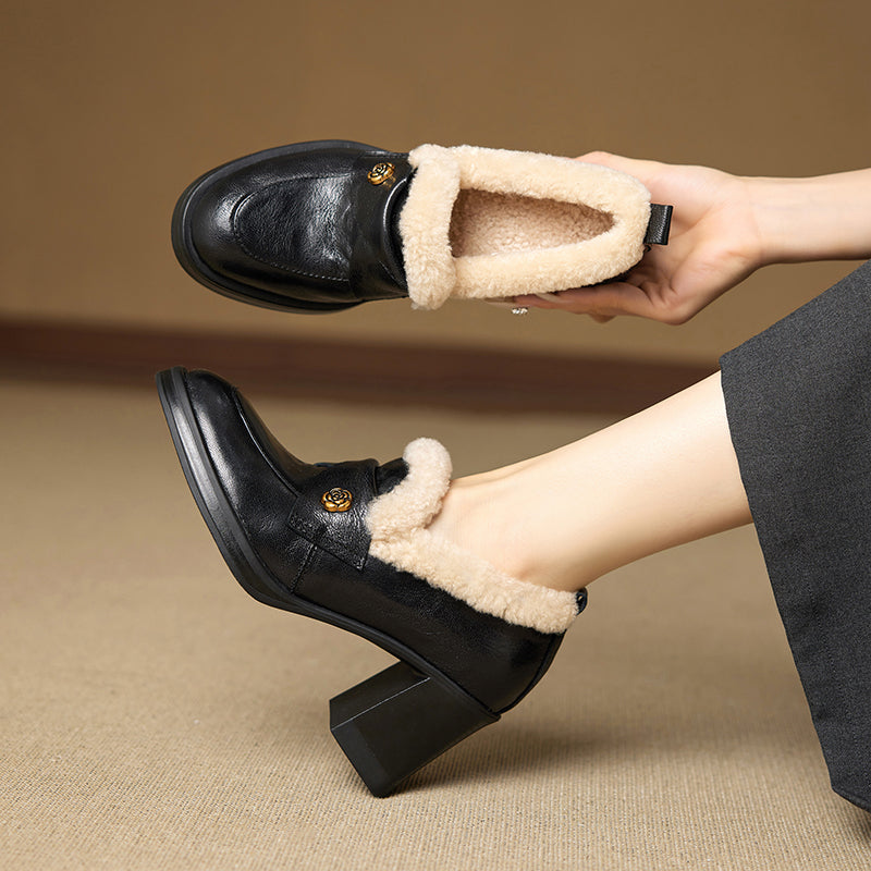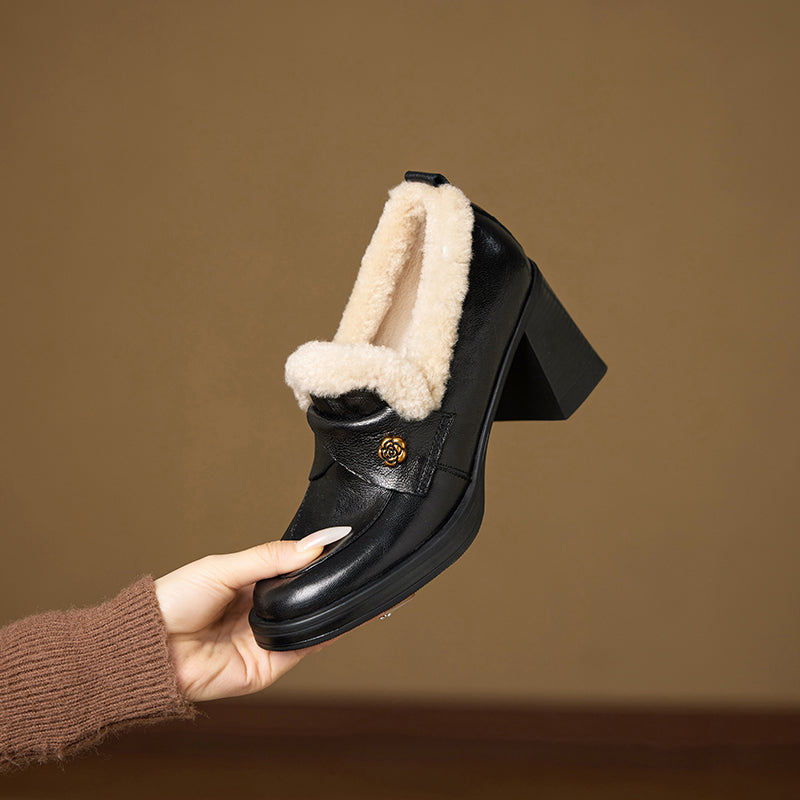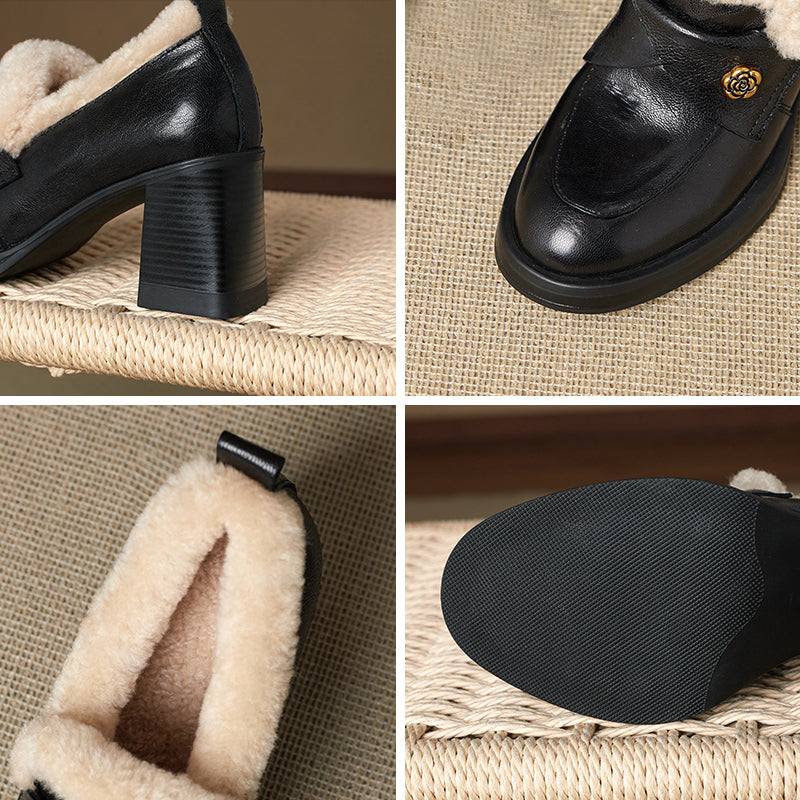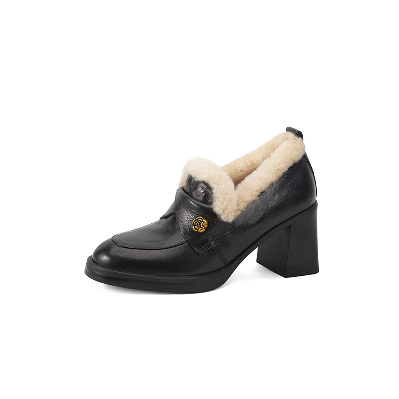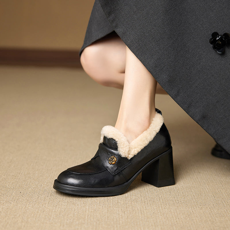 Stay warm and effortlessly chic with these women’s winter penny loafers, crafted from These women’s vintage penny loafer pumps are crafted from premium sheepskin leather and designed with a classic round toe silhouette. Featuring a stylish 70mm block heel, they offer elegant lift with all-day stability. The plush long-fur lining and lambswool footbed provide exceptional warmth and softness, making them ideal for winter wear. Finished with a refined metal camellia detail and a durable TPR outsole, these shaggy loafers blend timeless charm with modern comfort—perfect for casual, office, or dressy winter outfits.