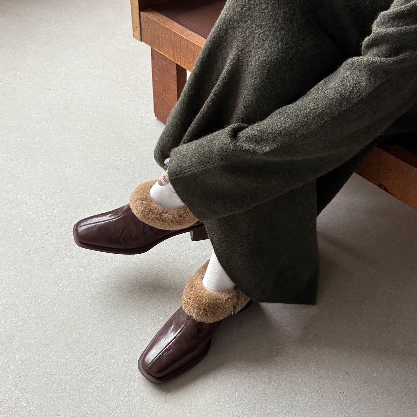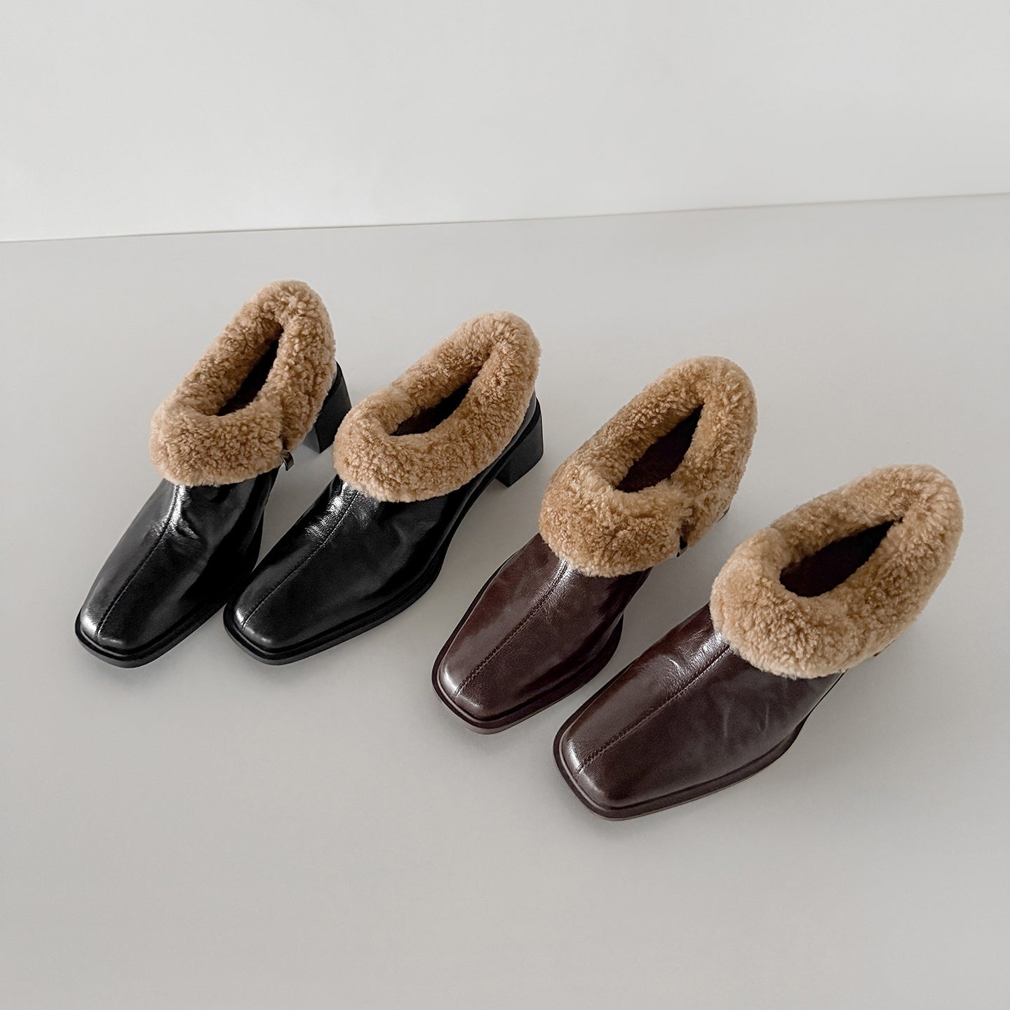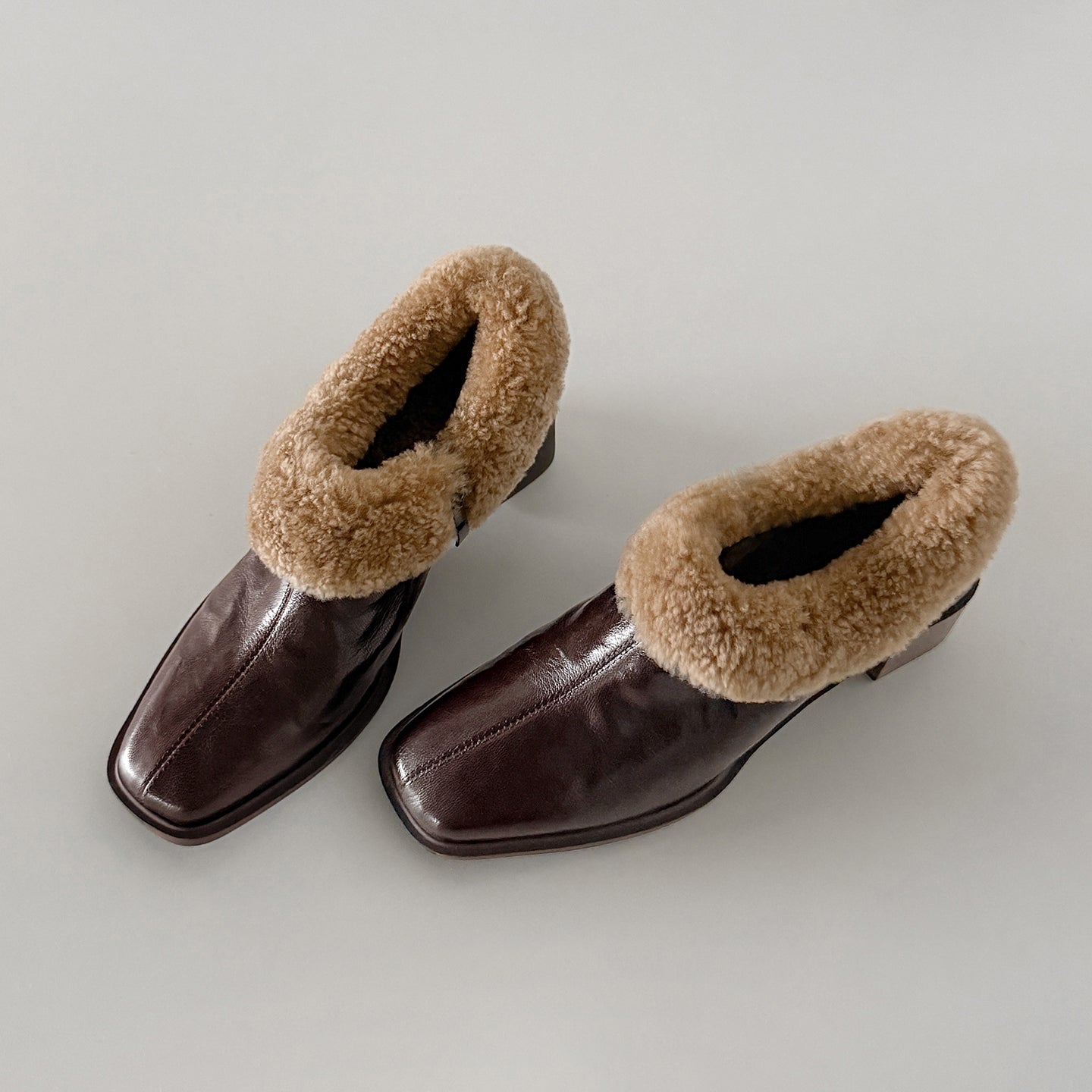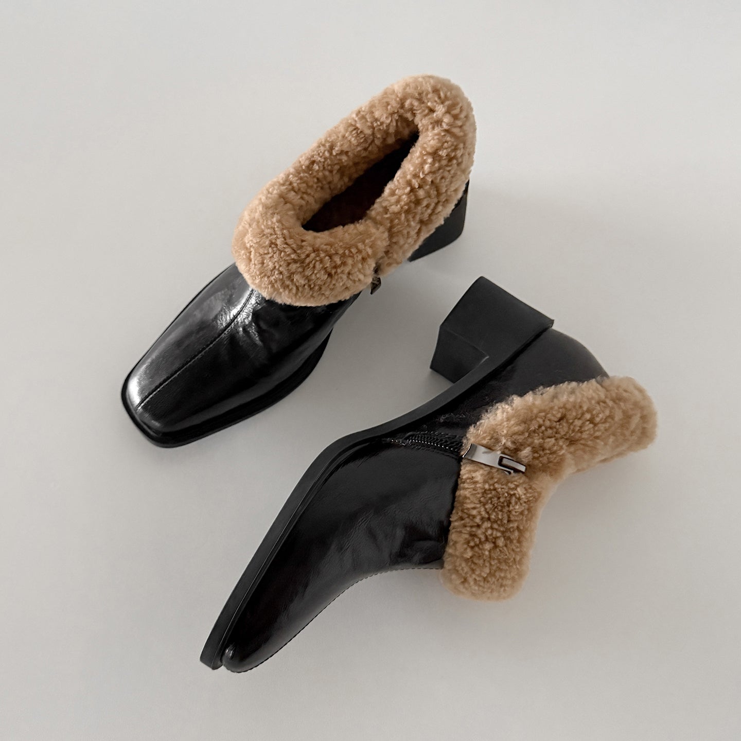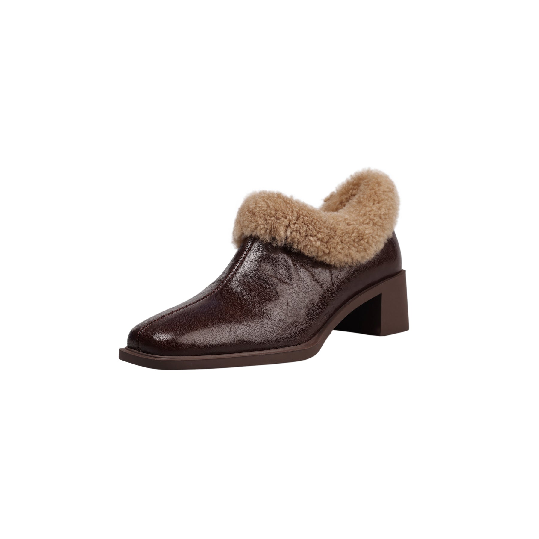Vintage Square Toe 50mm Block Heel Pumps Side Zip Shaggy Sheepskin Leather Shoes in Black/Brown