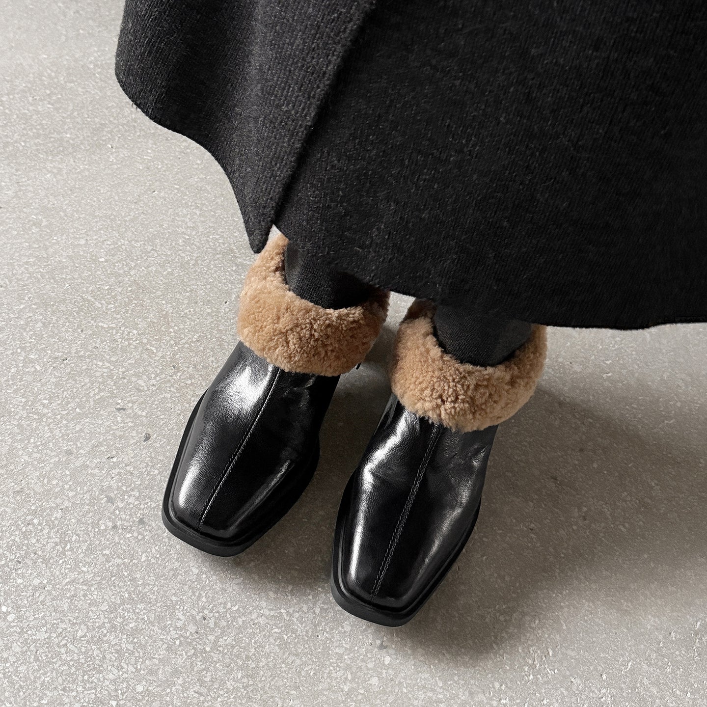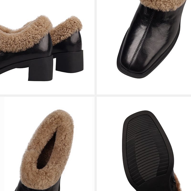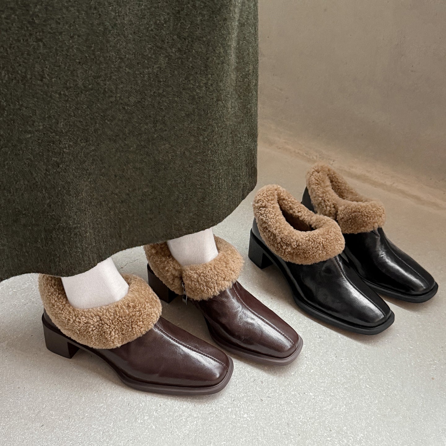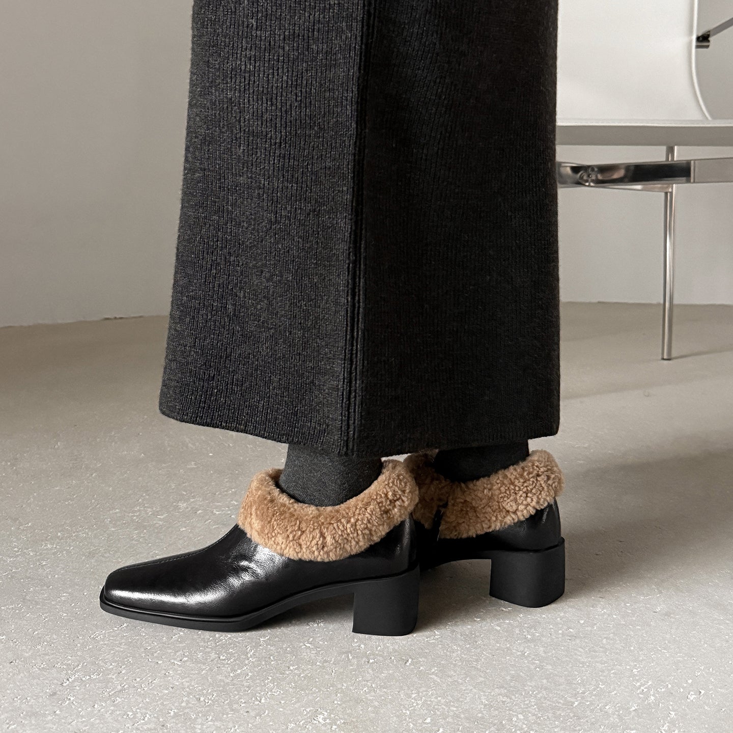 These women’s winter pumps feature a modern square toe design paired with a stable 50mm block heel, offering both style and everyday comfort. Made from premium top-layer sheepskin leather, with the convenient side zip. The interior is fully lined with plush long faux fur, and the cushioned footbed is finished with lamb wool for superior warmth and softness in cold weather. A durable rubber outsole provides reliable traction and stability. Perfect for winter wear, these shaggy block heel pumps combine warmth, comfort, and understated sophistication for daily outfits or smart-casual occasions.