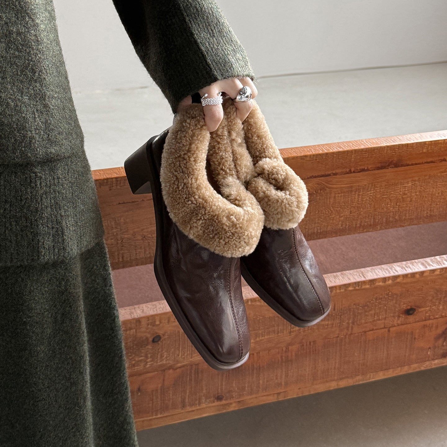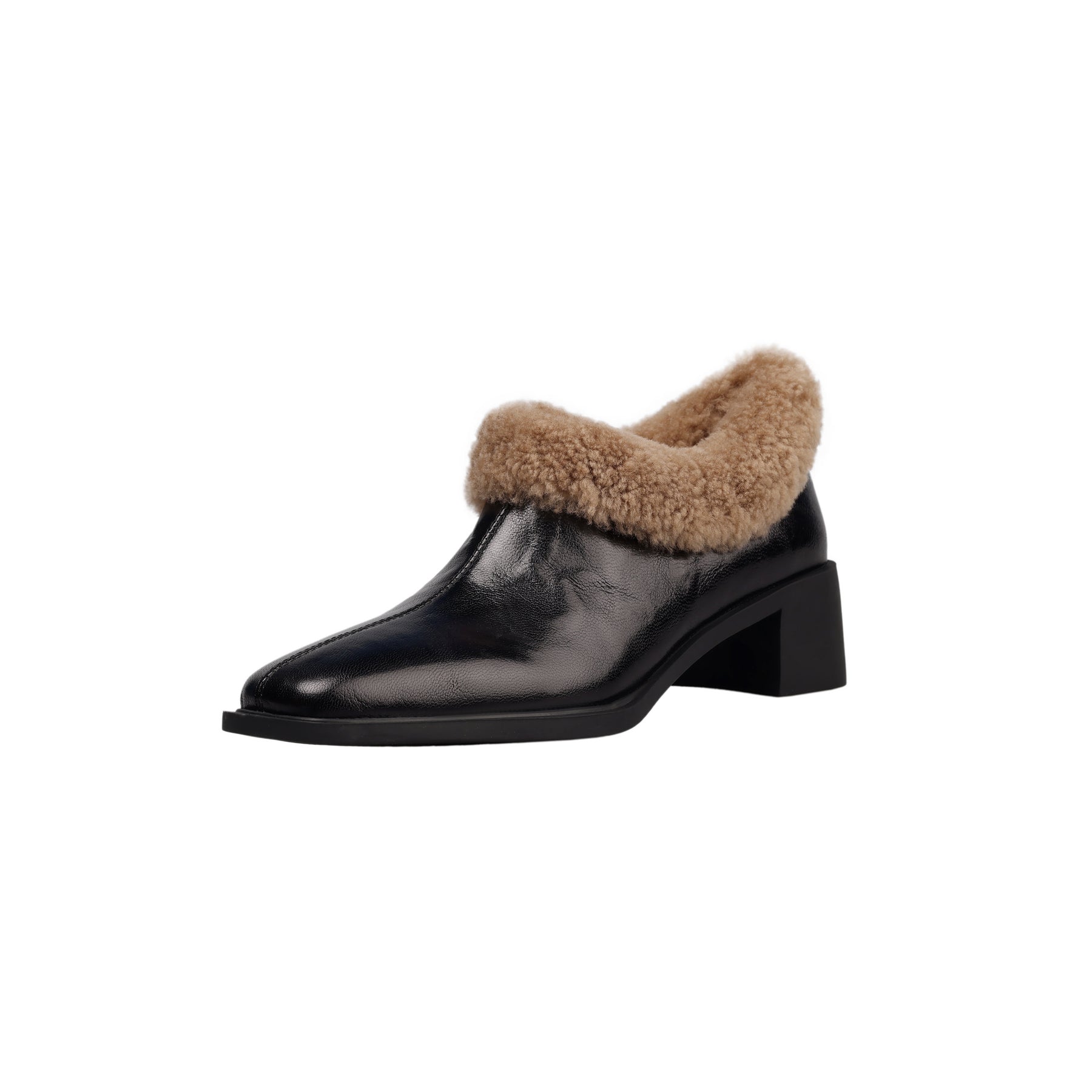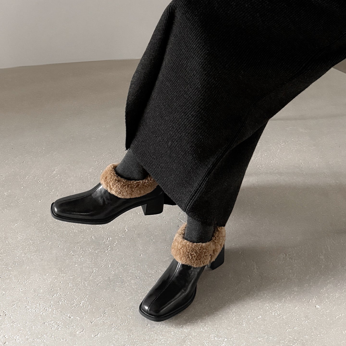 These women’s winter pumps feature a modern square toe design paired with a stable 50mm block heel, offering both style and everyday comfort. Made from premium top-layer sheepskin leather, with the convenient side zip. The interior is fully lined with plush long faux fur, and the cushioned footbed is finished with lamb wool for superior warmth and softness in cold weather. A durable rubber outsole provides reliable traction and stability. Perfect for winter wear, these shaggy block heel pumps combine warmth, comfort, and understated sophistication for daily outfits or smart-casual occasions.