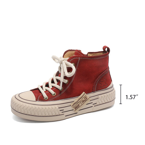 High-top Lace Up Flat Leather Sneakers for Women in Red/Brown/Beige