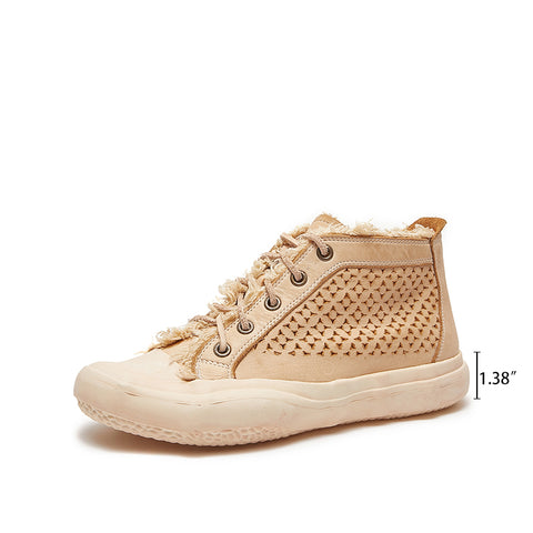 Leather Flatform High-top Perforated Sneakers for Women Fringed Detail in Apricot/Coffee