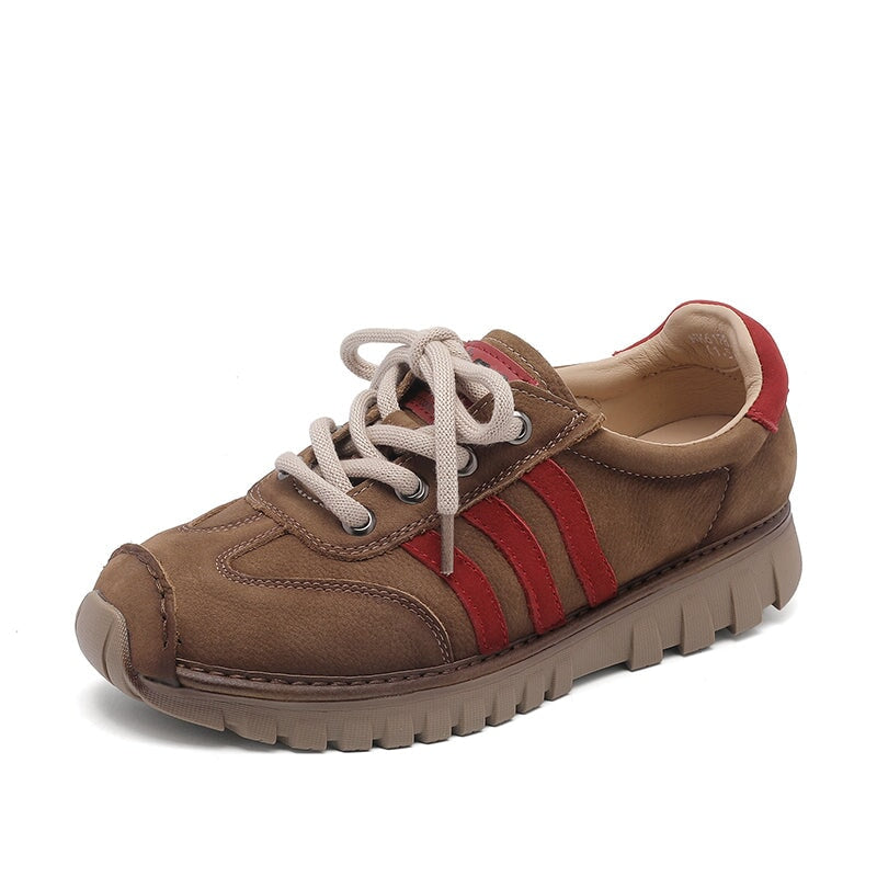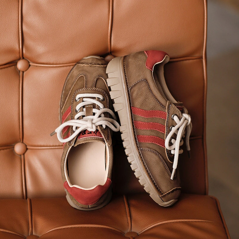 These German Training–style sneakers blend classic athletic design with lightweight everyday comfort. Crafted from premium top layer cow leather, the upper offers durability, breathability, and a clean, structured look. The signature three contrasting red side stripes add a bold retro accent inspired by vintage training shoes. A flexible rubber outsole delivers reliable traction while keeping the shoes light and easy to walk in.