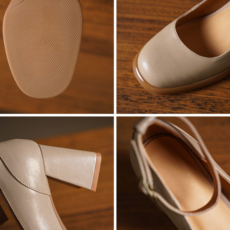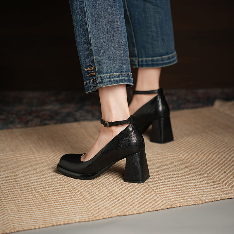 ハンドメイドレザーパンプス メリージェーンハイヒール スクエアトゥ ブラック/ブラウン