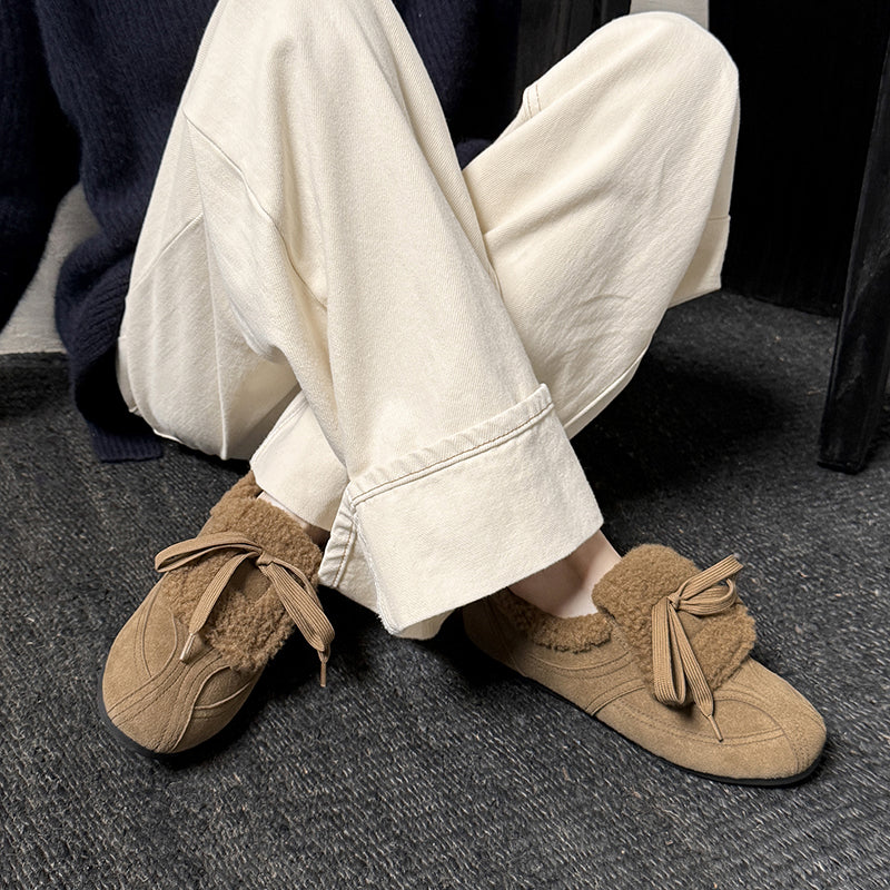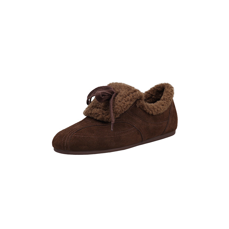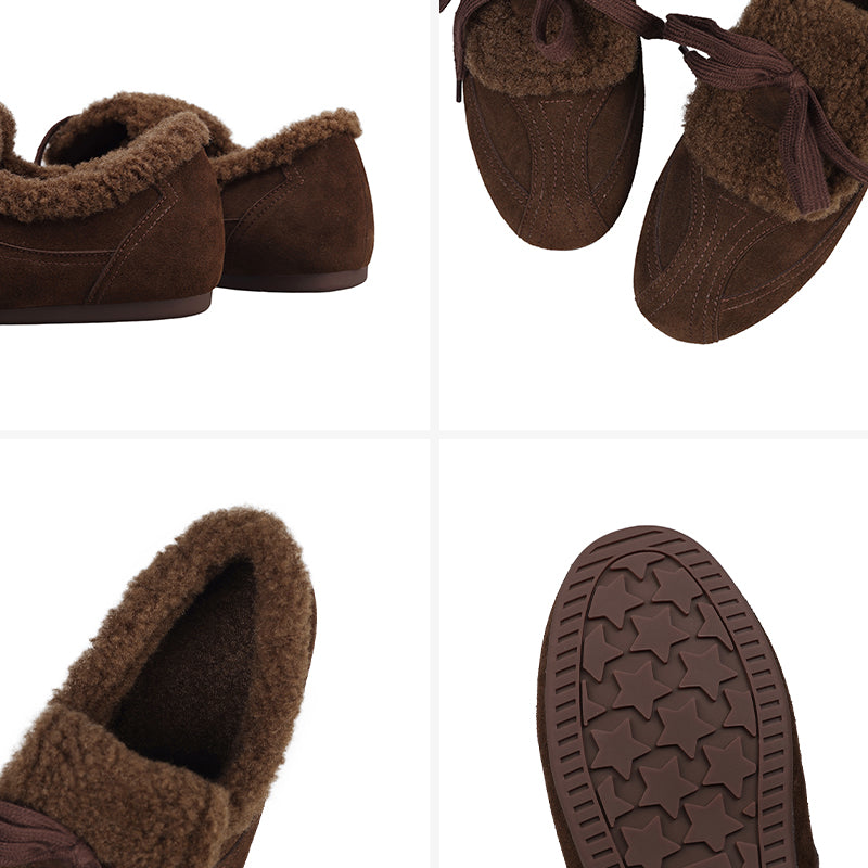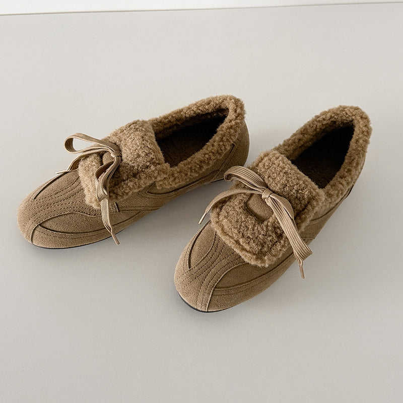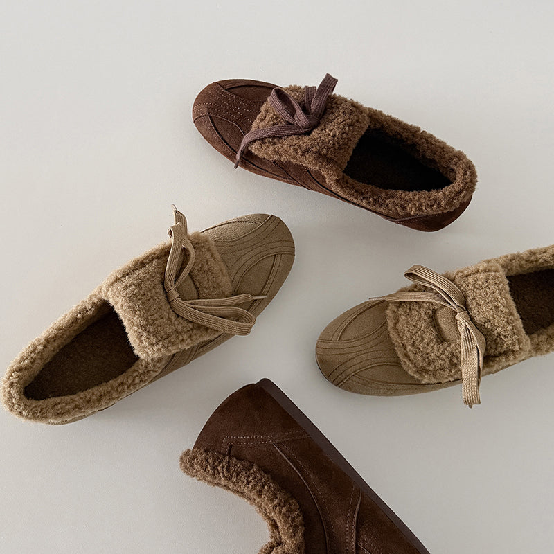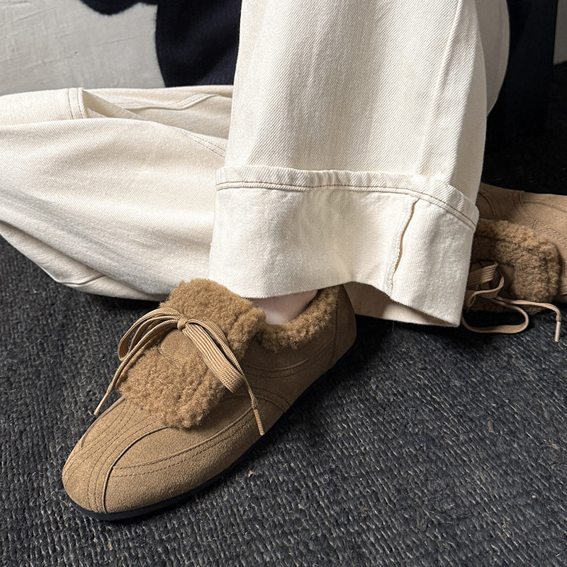 These women’s winter shaggy flat oxford shoes feature a classic round-toe silhouette with a delicate bow-tie and lace-up design for a soft, feminine look. Crafted from a premium mix of sheepskin leather or cow suede leather, they offer a smooth, cozy feel. The warm fleece lining and short plush insole keep feet comfortable during colder days, while the flexible rubber outsole provides stable, everyday wear. Perfect for casual winter outfits, these soft lace-up flats combine warmth, comfort, and effortless style.