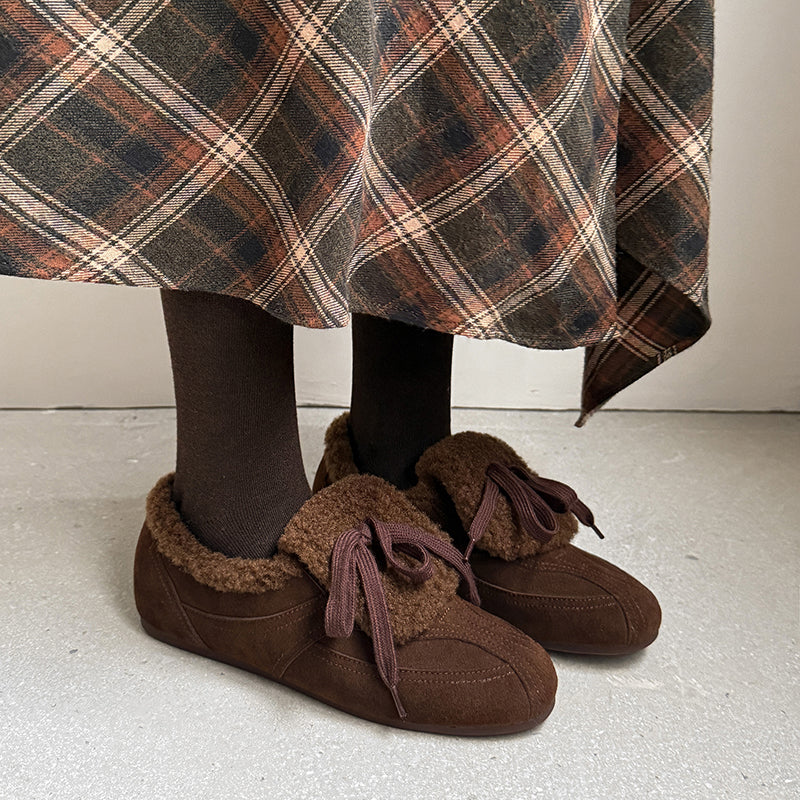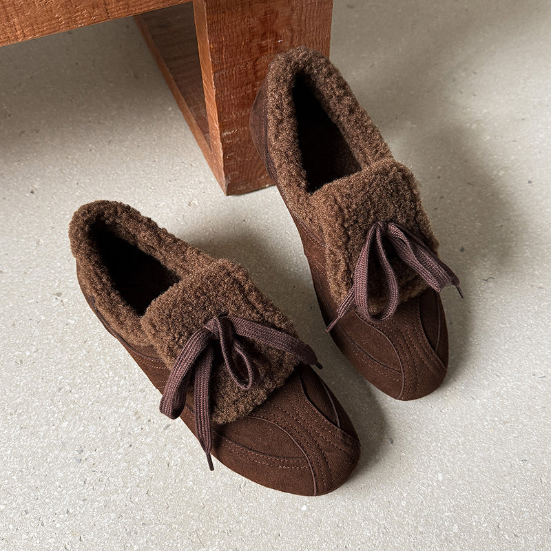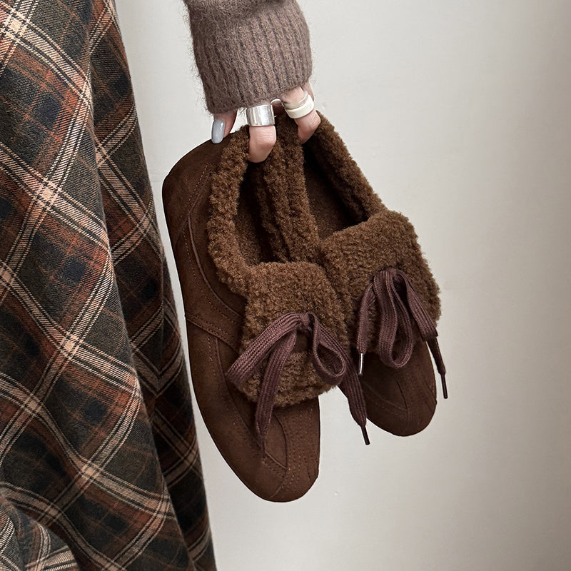 Casual Winter Shaggy Suede Leather Lace-Up Flats with Plush Lining in Brown/Apricot
