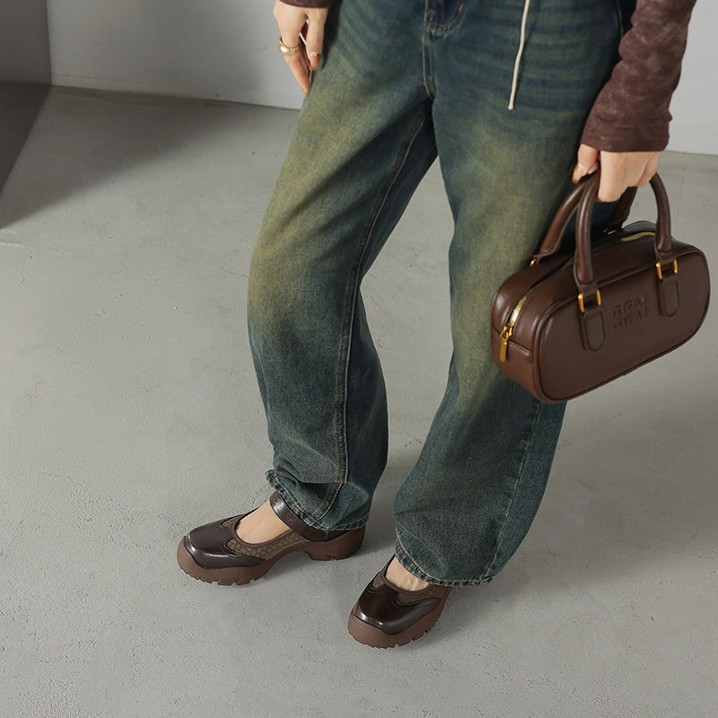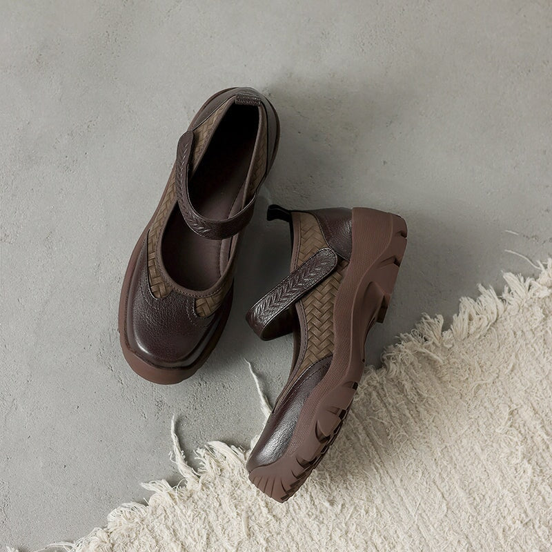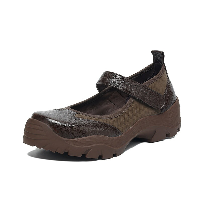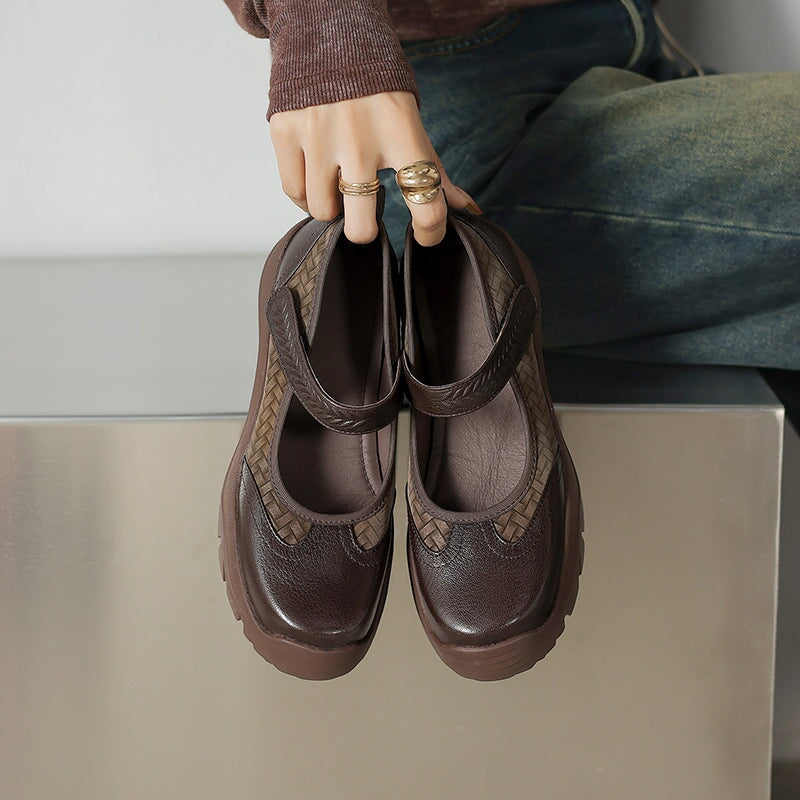 メリージェーン 快適なレザー編みベルト フラット パンチングデザイン ベージュ/カーキ