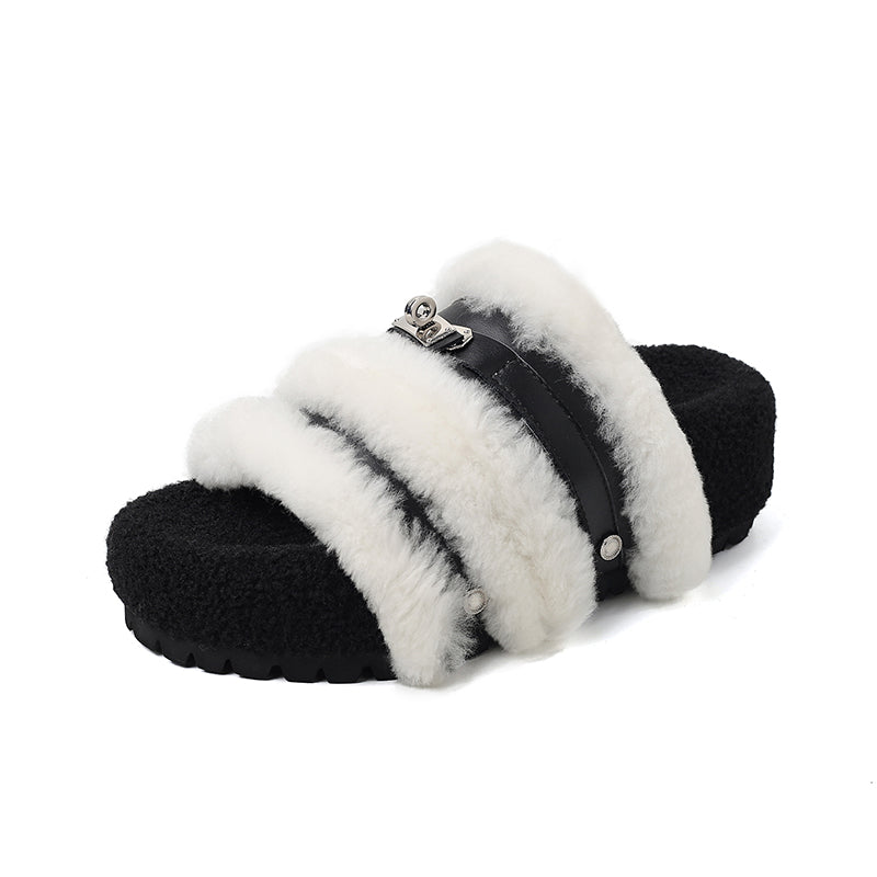 Winter Furry Open-Toe Slippers Shaggy Cow Leather Platform Flat Indoor/Outdoor Slides in Black and White/Brown