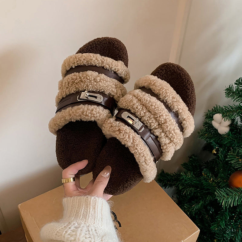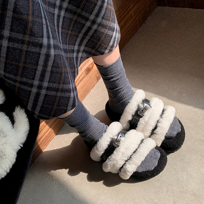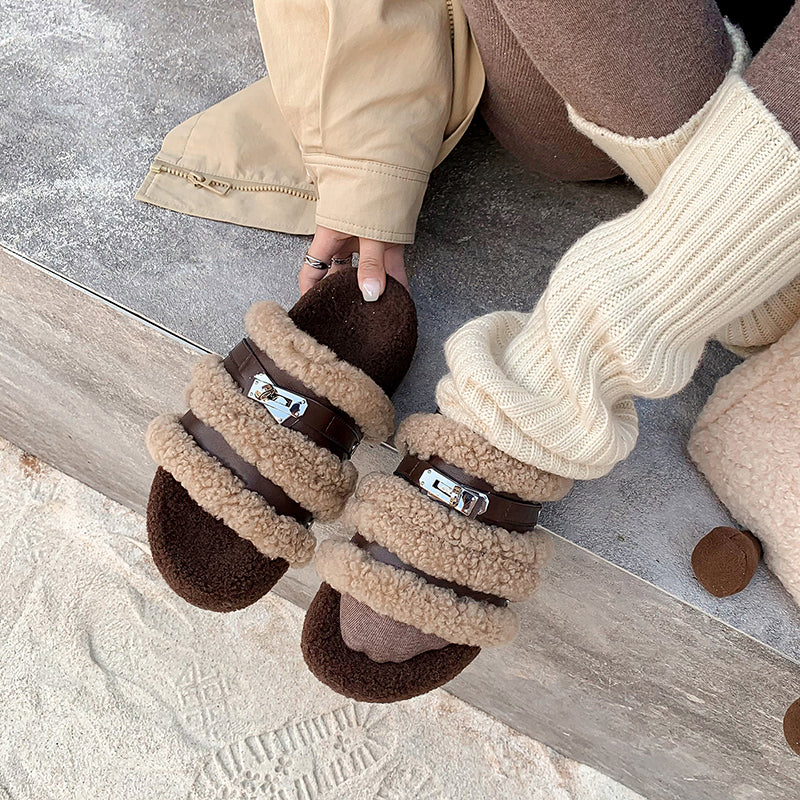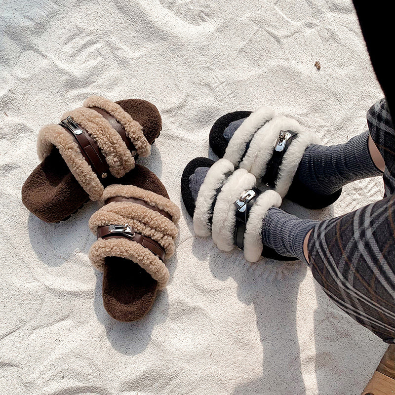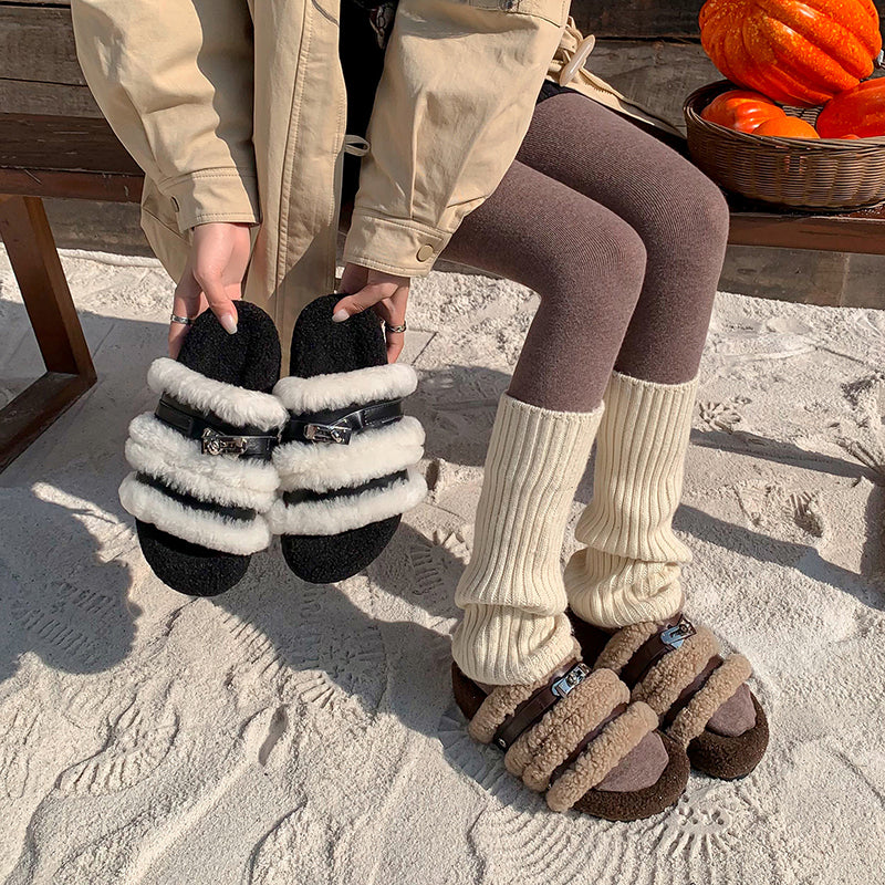 Stay cozy and stylish all winter long with these furry open-toe winter slippers. Designed with a shaggy fleece upper, short plush lining and premium cow leather straps, they offer both warmth and a luxe textured look. The 50mm platform sole crafted from durable TPR provides lightweight support and extra comfort for indoor or outdoor wear. Perfect for cold seasons, these flat winter slides keep your feet snug while adding a chic touch to your everyday lounging.