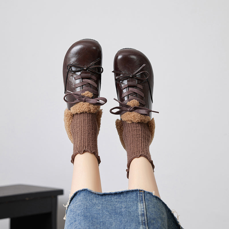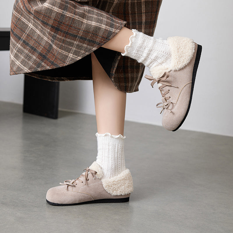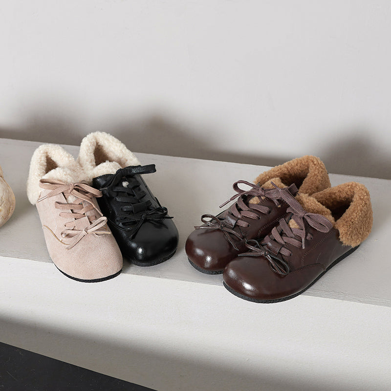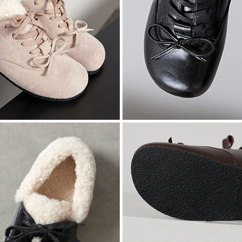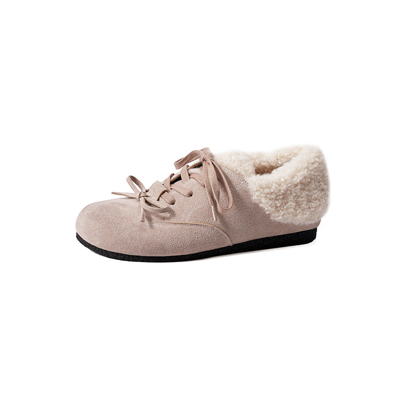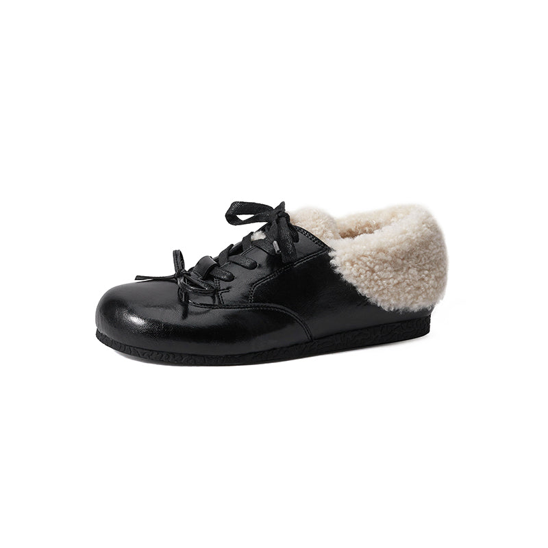 These women’s winter shaggy flat oxford shoes feature a classic round-toe silhouette with a delicate bow-tie and lace-up design for a soft, feminine look. Crafted from a premium mix of sheepskin leather or cow suede leather, they offer a smooth, cozy feel. The warm fleece lining and short plush insole keep feet comfortable during colder days, while the flexible rubber outsole provides stable, everyday wear. Perfect for casual winter outfits, these soft lace-up flats combine warmth, comfort, and effortless style.