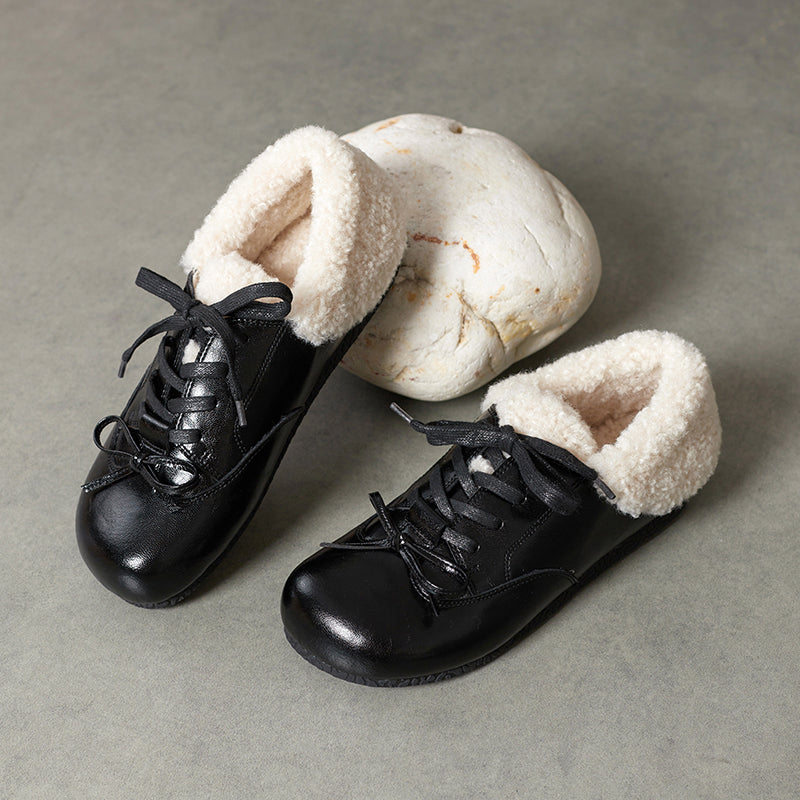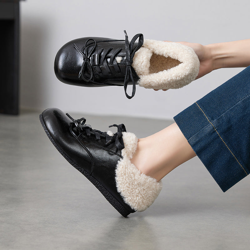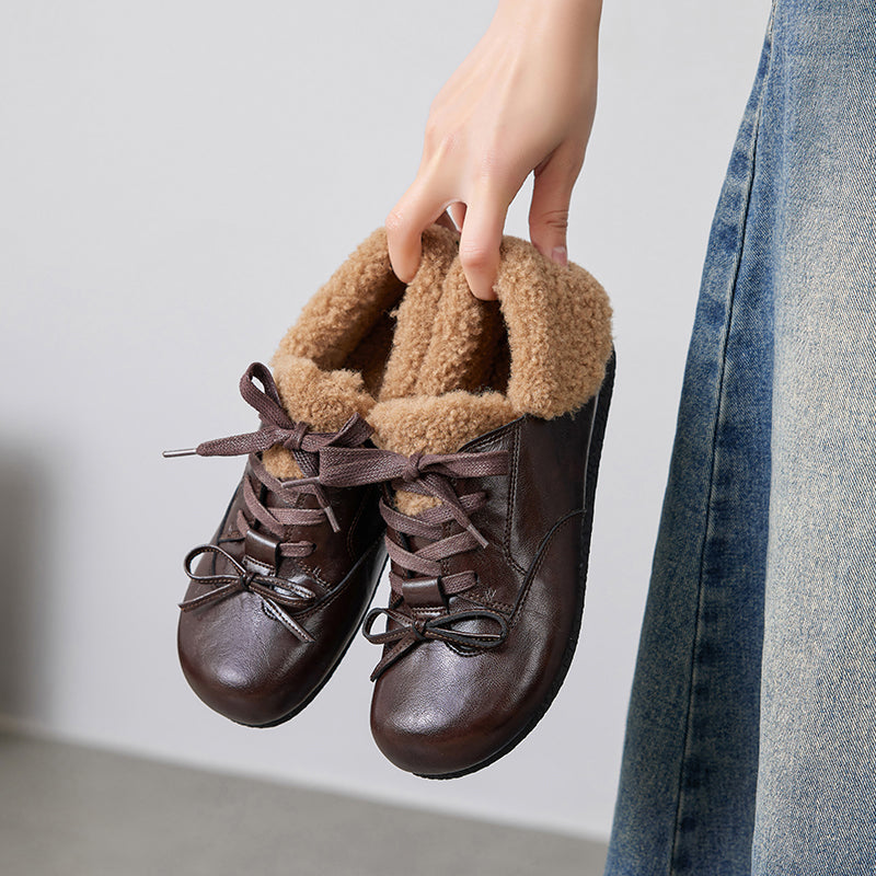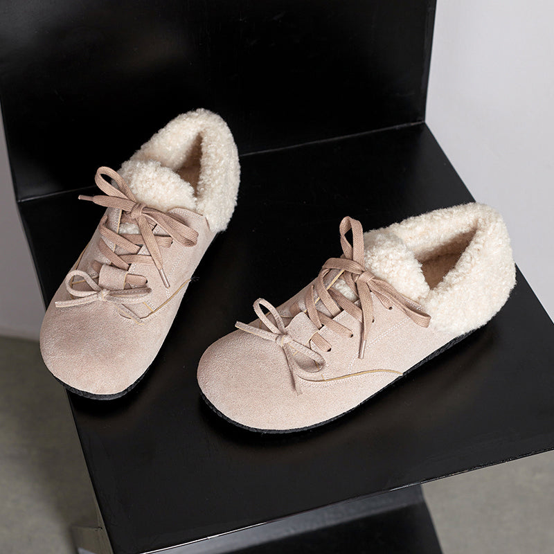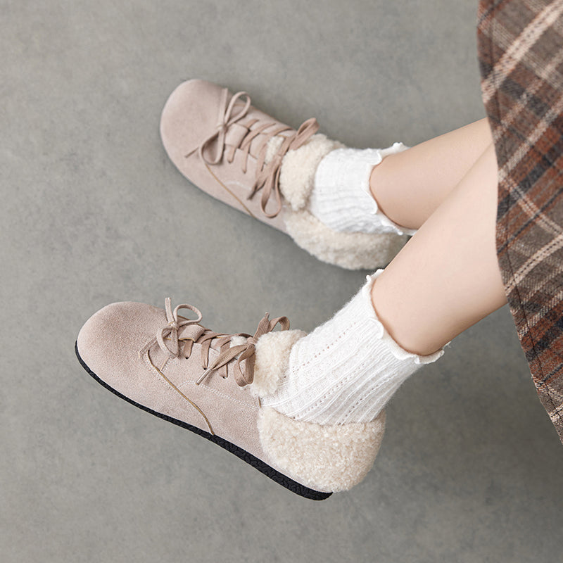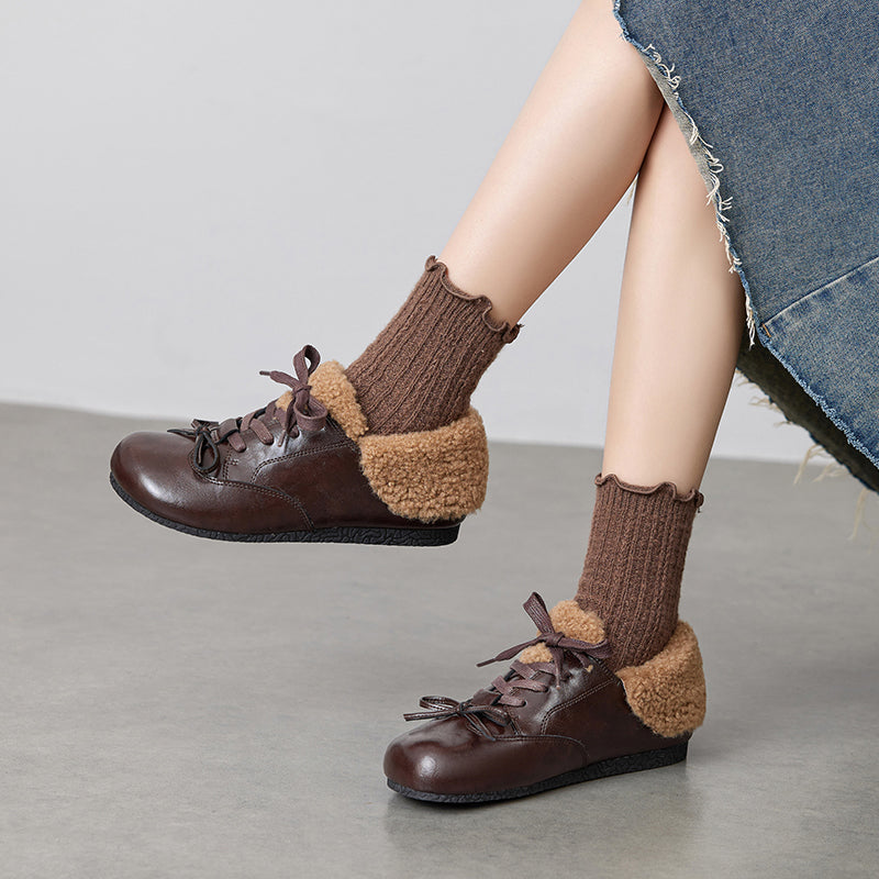 These women’s winter shaggy flat oxford shoes feature a classic round-toe silhouette with a delicate bow-tie and lace-up design for a soft, feminine look. Crafted from a premium mix of sheepskin leather or cow suede leather, they offer a smooth, cozy feel. The warm fleece lining and short plush insole keep feet comfortable during colder days, while the flexible rubber outsole provides stable, everyday wear. Perfect for casual winter outfits, these soft lace-up flats combine warmth, comfort, and effortless style.