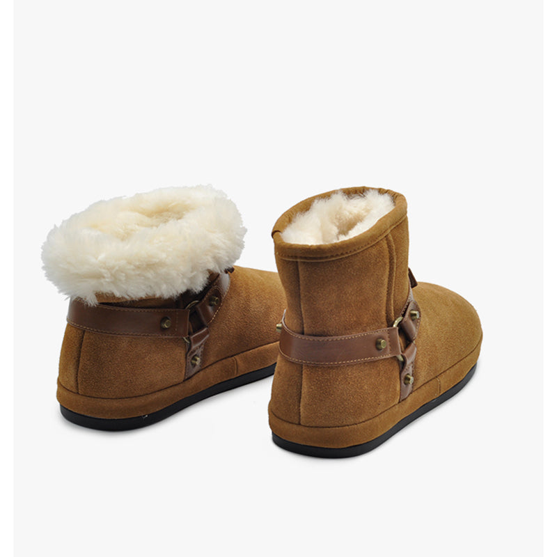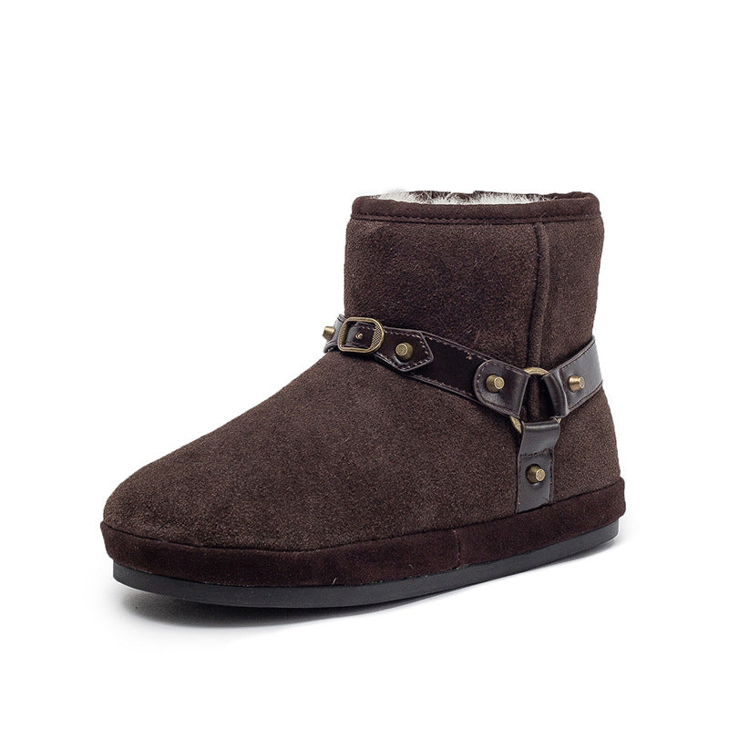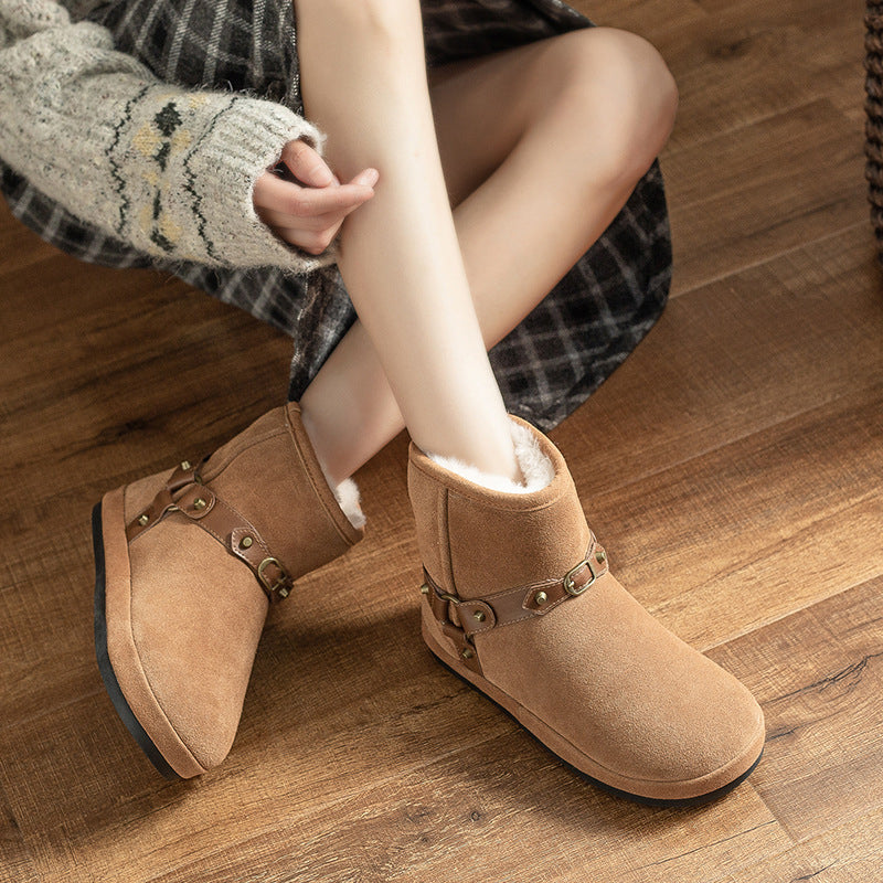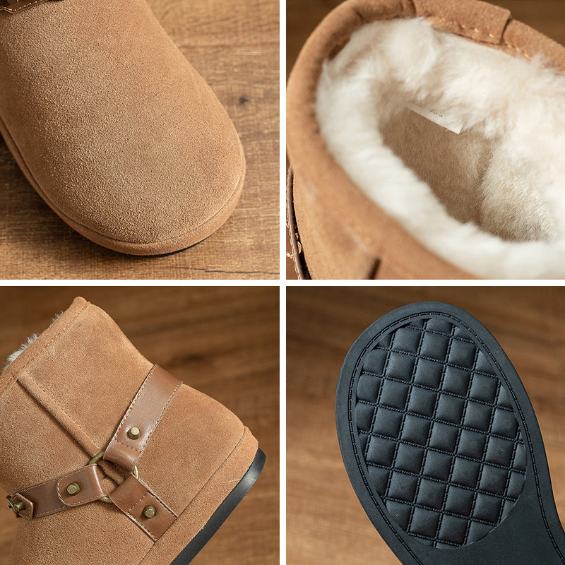 Keep your feet warm and stylish all season with these women’s winter suede snow boots, featuring a classic round toe and cozy fleece lining for exceptional insulation. Made from durable split cow suede with a chic studded strap, these flat ankle boots offer both comfort and fashion. The non-slip rubber sole provides secure traction in cold or snowy weather, making them perfect for everyday winter wear. A great blend of warmth, style, and practicality for the winter months.