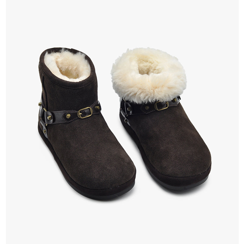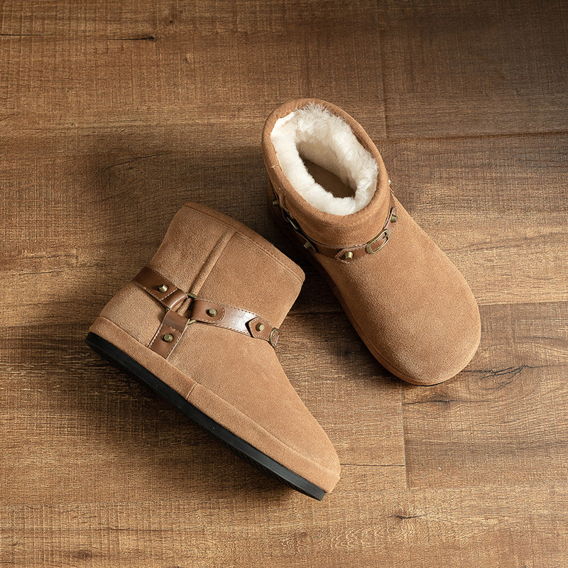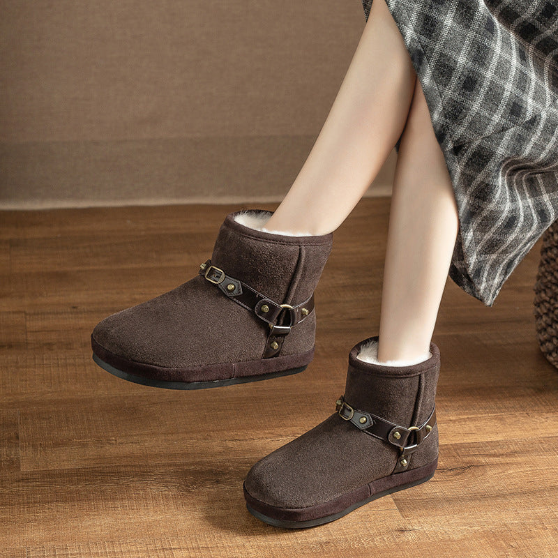 Women’s Winter Suede Snow Boots Warm Fleece-Lined Flat Ankle Boots with Studded Strap in Brown Coffee/Khaki