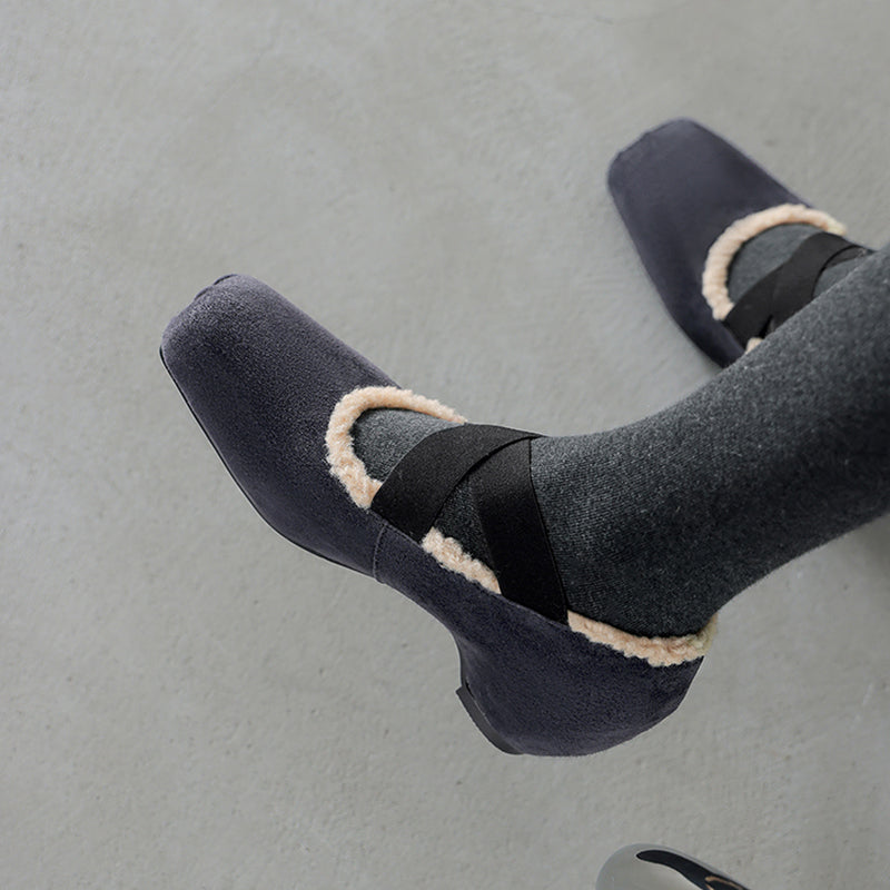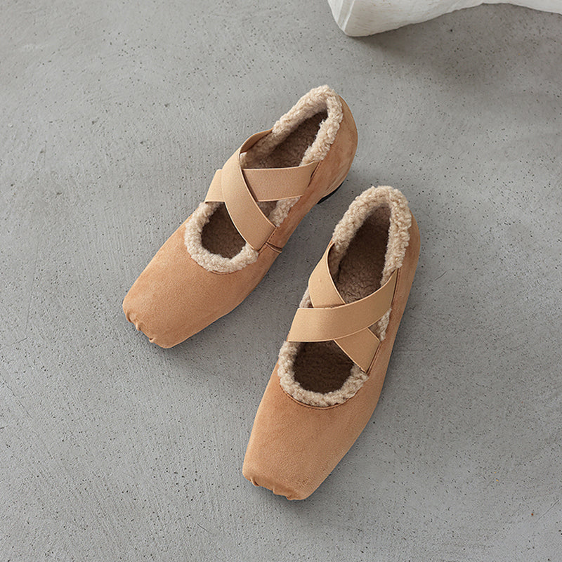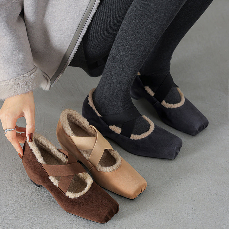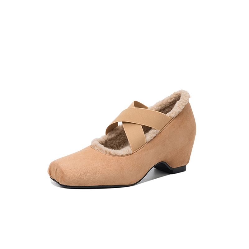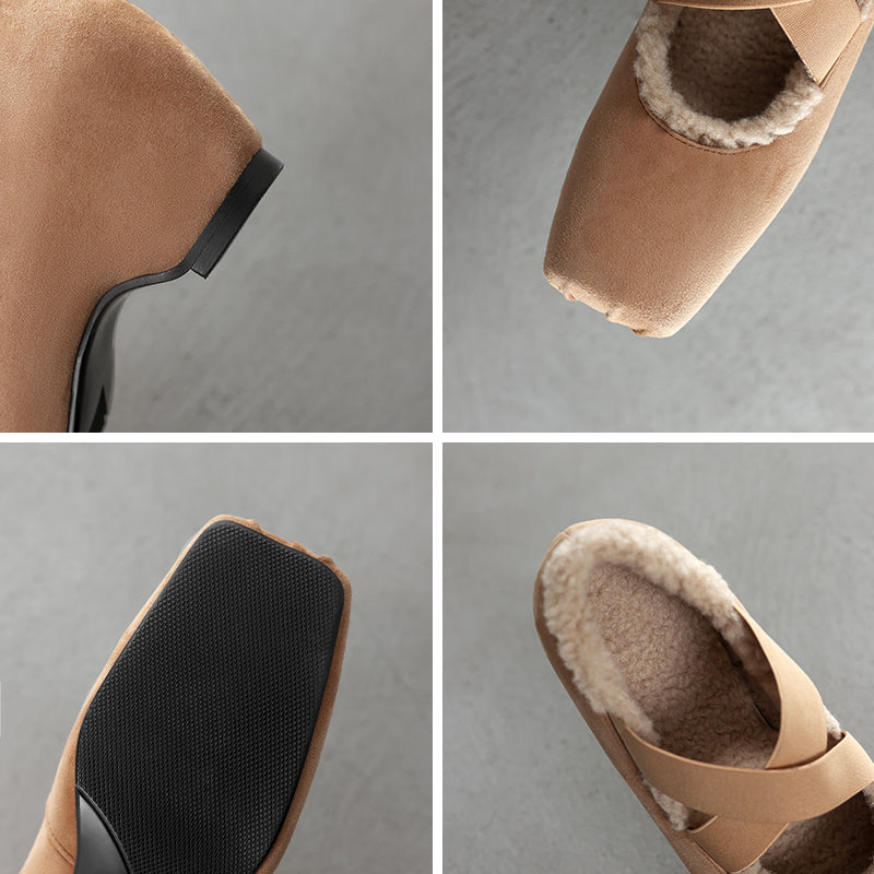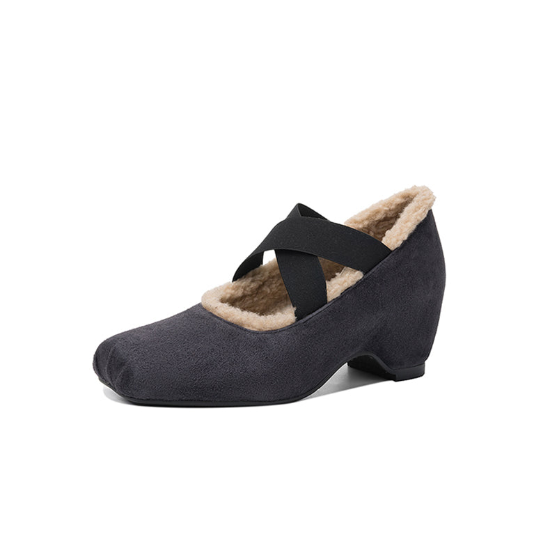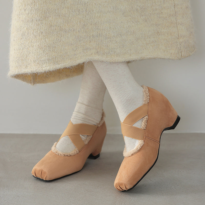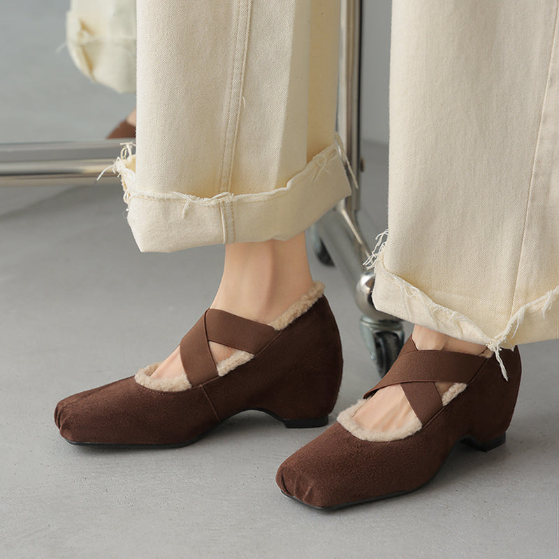 Made from premium sheepskin suede leather, these Mary Jane shoes feature a modern square toe and a chic X-strap design for a secure, flattering fit. Designed with a hidden inner wedge, these block heel pumps subtly add height while keeping the silhouette balanced and easy to walk in. The short plush lining and furry insole provide warmth and softness for colder seasons, while the durable rubber outsole ensures stability and everyday wearability.