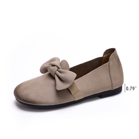 滑らかで光沢のあるレザーアッパー、丸いつま先のデザイン、リボンの蝶結びの装飾。