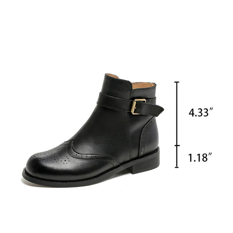 レディース レザー チェルシーブーツ ブローグ カービング バックル デコレーション ブラック/ブラック