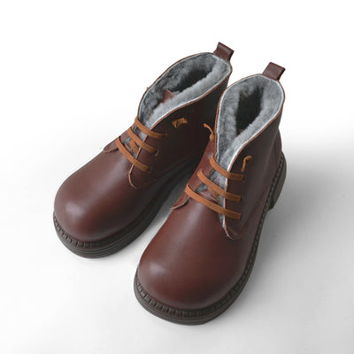 ソフトレザーウール裏地アンクルブーツ レトロ ラウンドトゥ ショートブ...