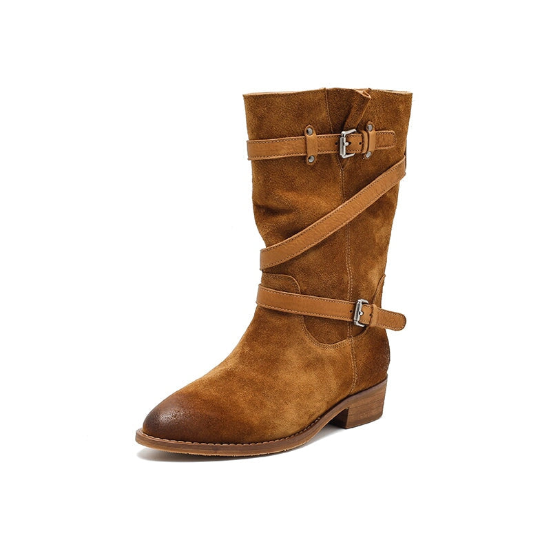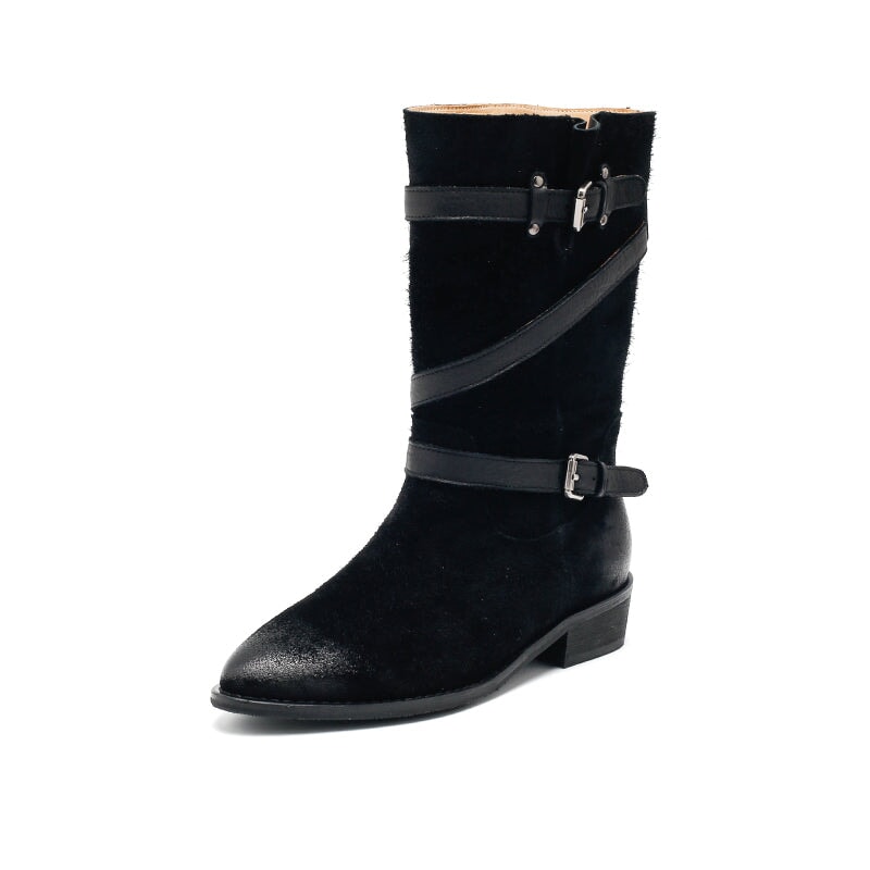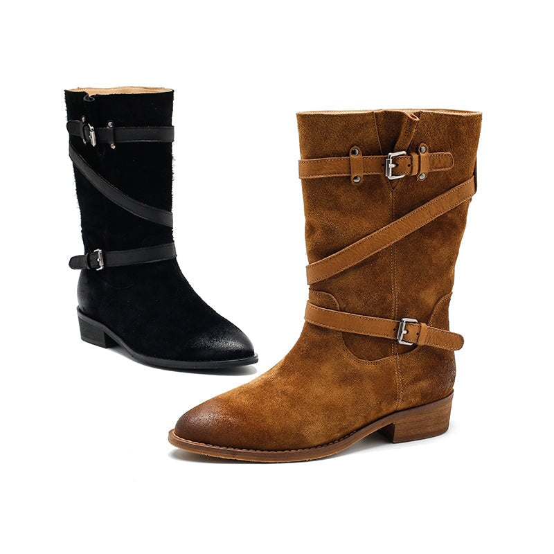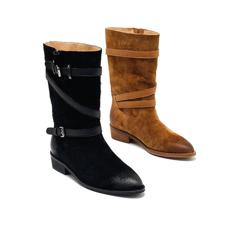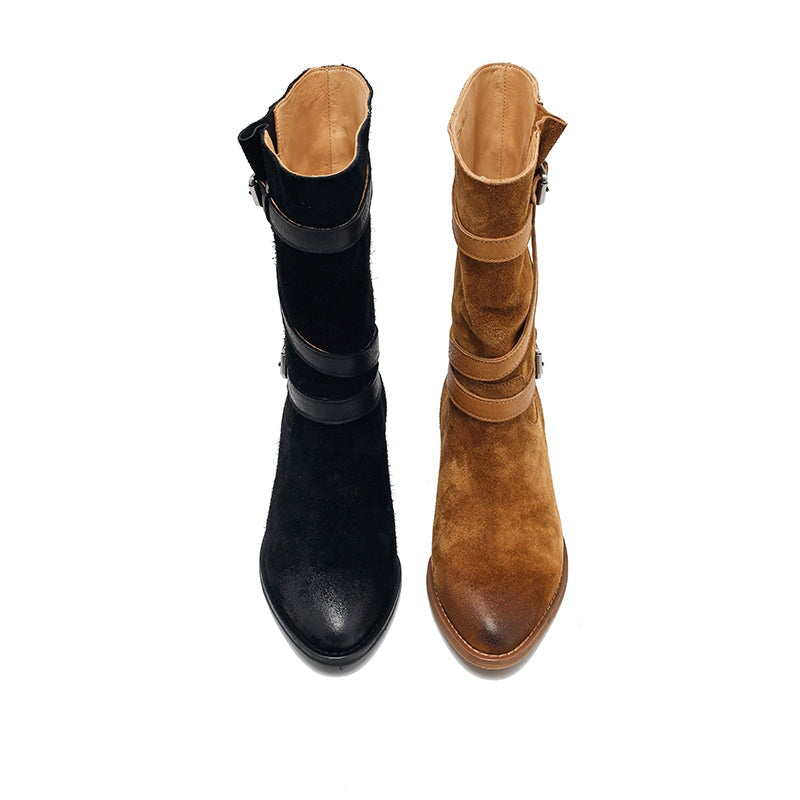 レディース スエードレザー ミッドカーフブーツ ブラック/カーキ