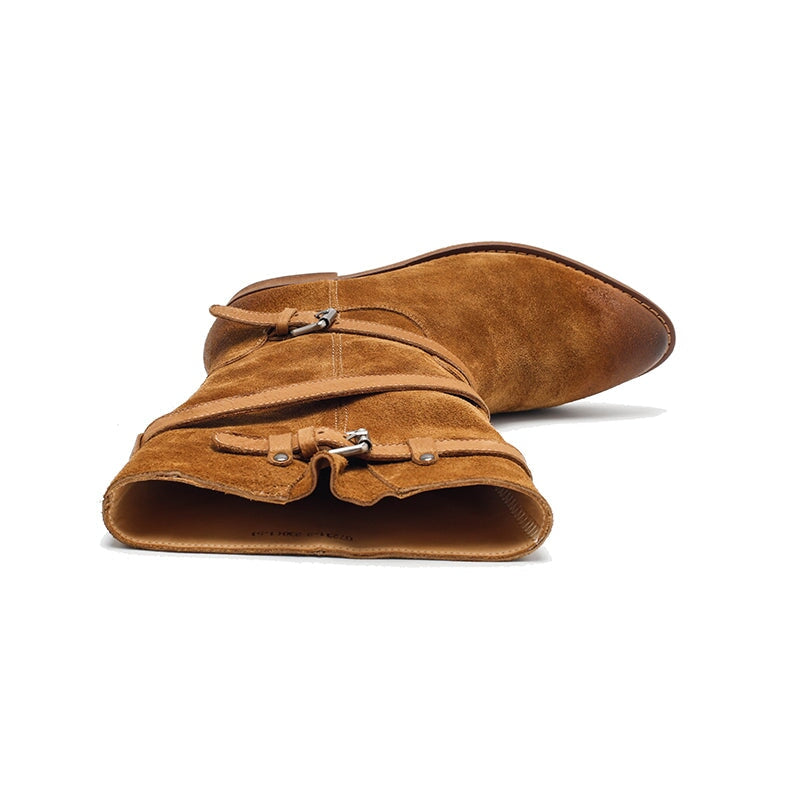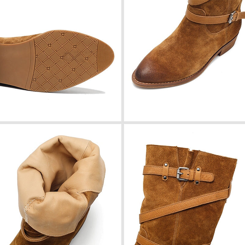 これらのチューブラーブーツは、高級スエードレザーを使用して中国で作られています。開口部にダブルプルタブがあり、シャフトがわずかに幅広なので、スカートと組み合わせたり、ズボンをブーツに押し込んだりするのに最適です。